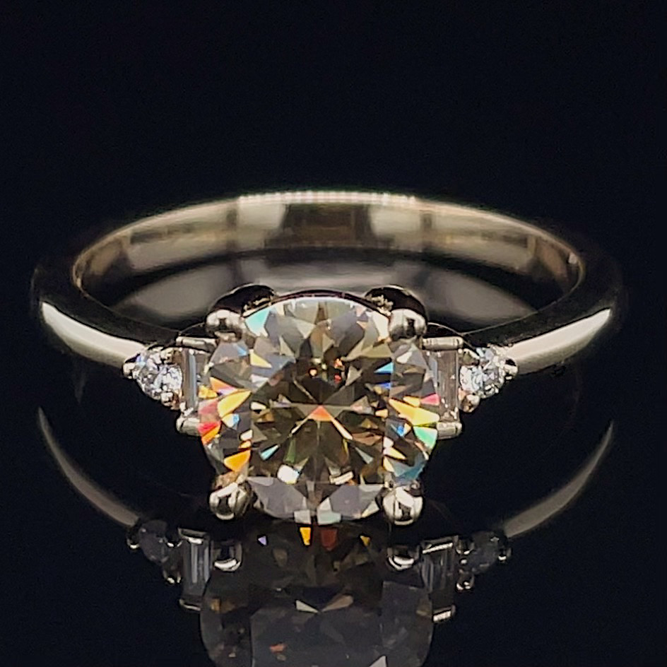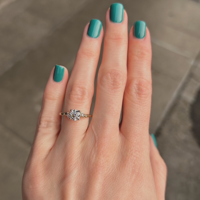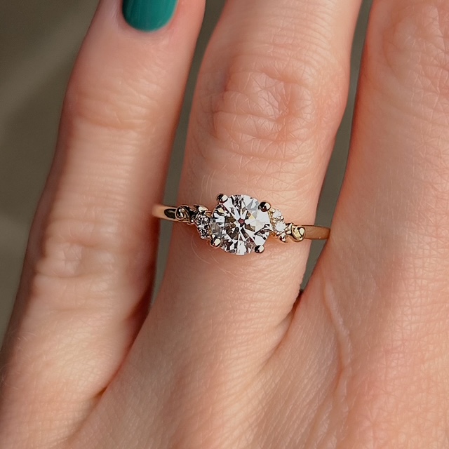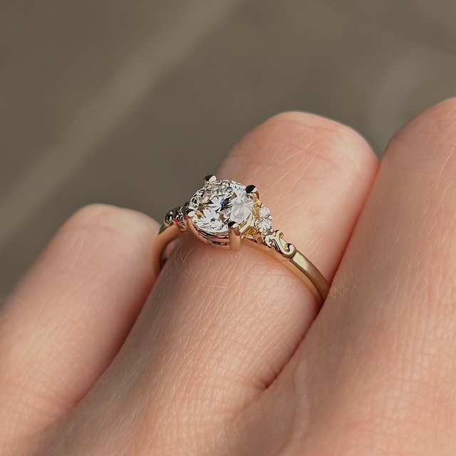 Crafted of 14k yellow gold, this ring features a dazzling natural round brilliant diamond in the center, with natural diamond accents and engravings beautifully complementing the band. We do our best to capture the vibrancy of the stones and metal, though this piece looks even better in person! This is a ring can be sized up or down. First sizing is complimentary.
