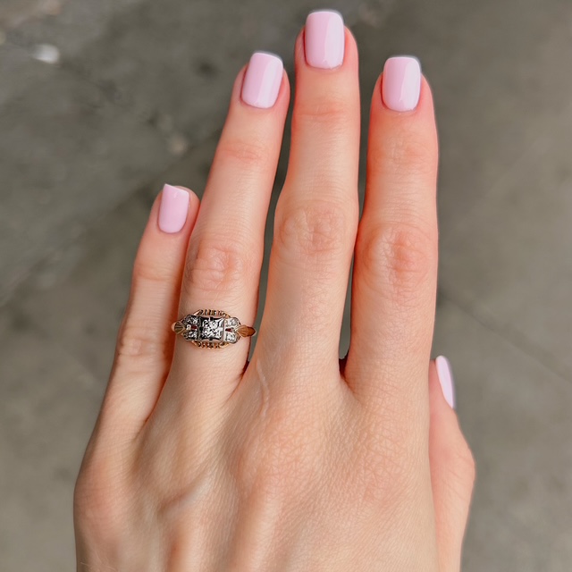 Crafted of 14k yellow & white gold, this antique ring features old cut diamonds and intricate metal work. We do our best to capture the vibrancy of the stones and metal, though this ring is even more beautiful in person.
