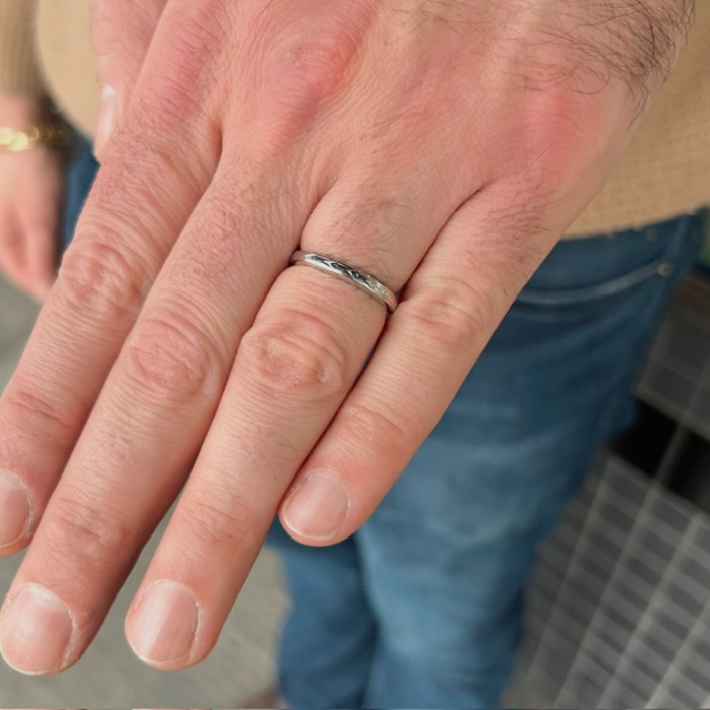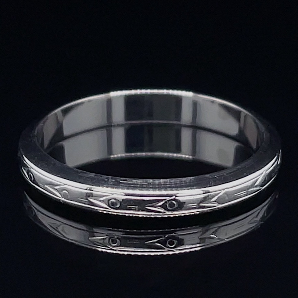 Crafted of 18k white gold, this antique band features lovely hand carved engraving, making it truly one-of-a-kind. This ring is 3mm wide and is size 8.75. It can be sized up or down, and the first sizing is complimentary. We do our best to capture the vibrancy of the stones and metal, though this piece looks even better in person.