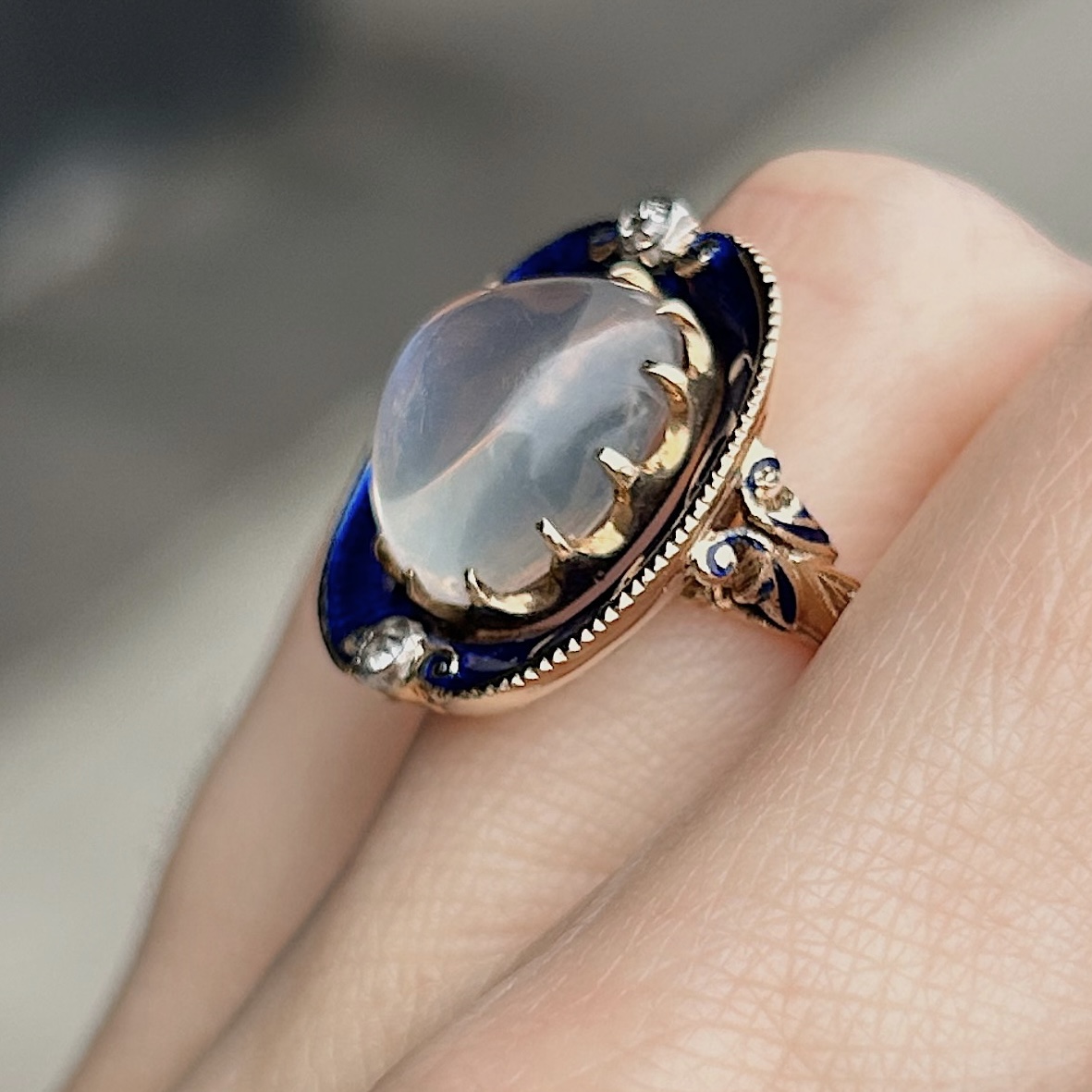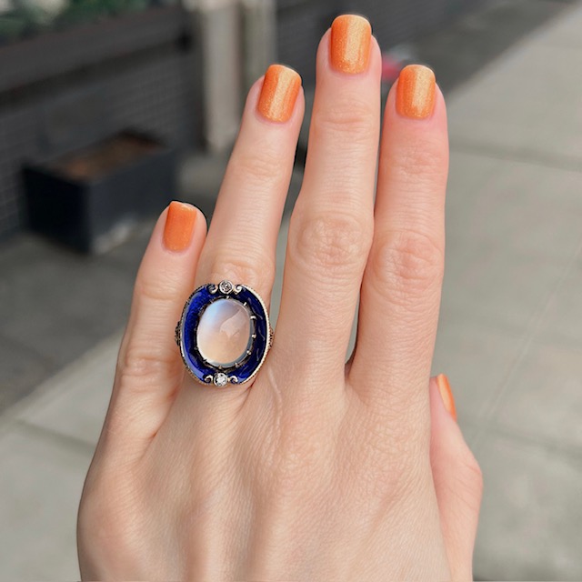 Crafted of 14k yellow gold, this antique ring features a genuine moonstone set central with claw prongs and has a natural diamond on the top and bottom of the moonstone. Surrounding the stones is a wonderfully blue enamel inlay featuring handcrafted engravings along the band. Absolutely stunning and one-of-a-kind! We do our best to capture the vibrancy of the stones and metal, though this ring is even more beautiful in person.