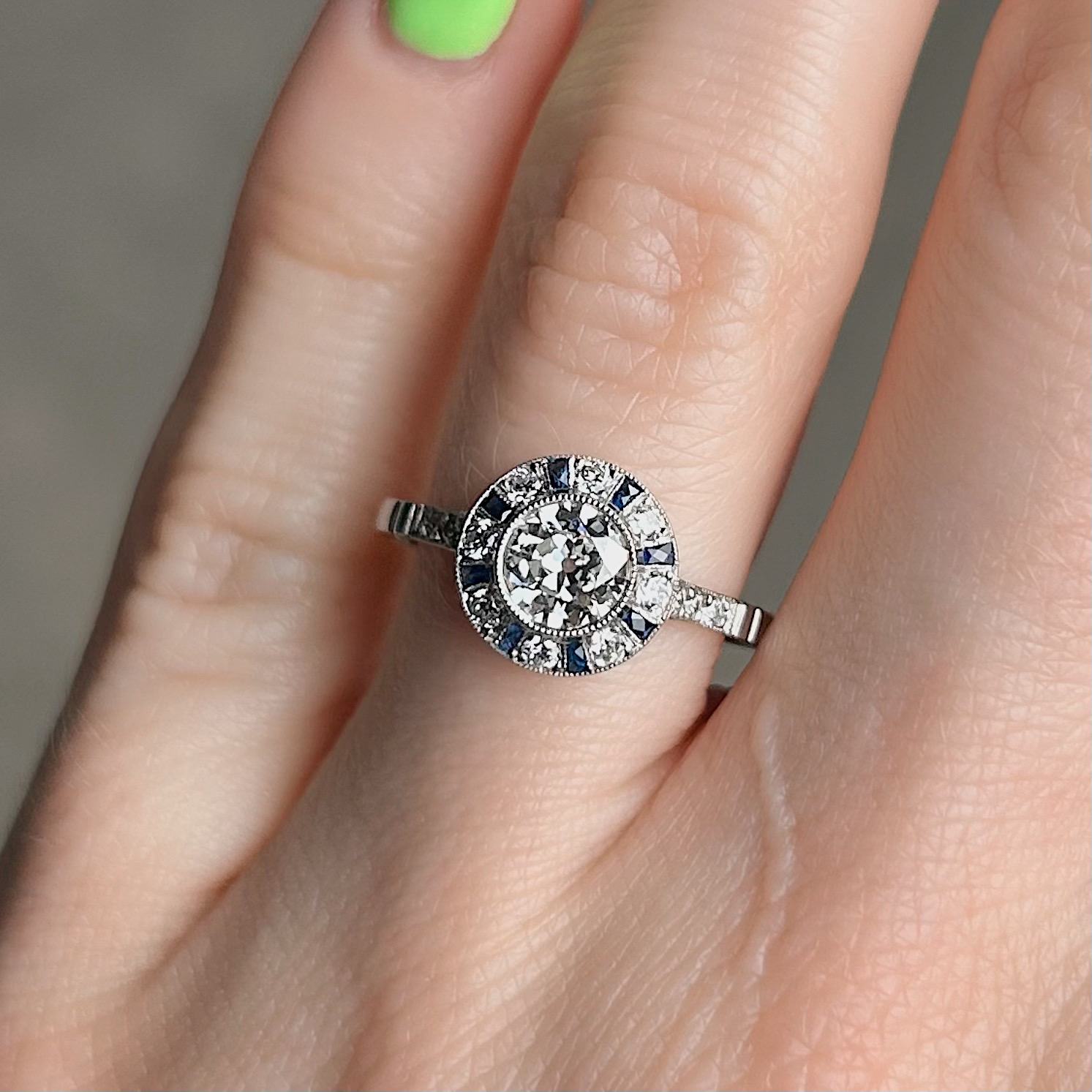 Crafted of platinum, this ring features a natural old European cut diamond in the center, with a halo of natural diamonds and sapphires, with diamonds on the band. We do our best to capture the vibrancy of the stones and metal, though this piece looks even better in person! This is a ring can be sized up or down. First sizing is complimentary.