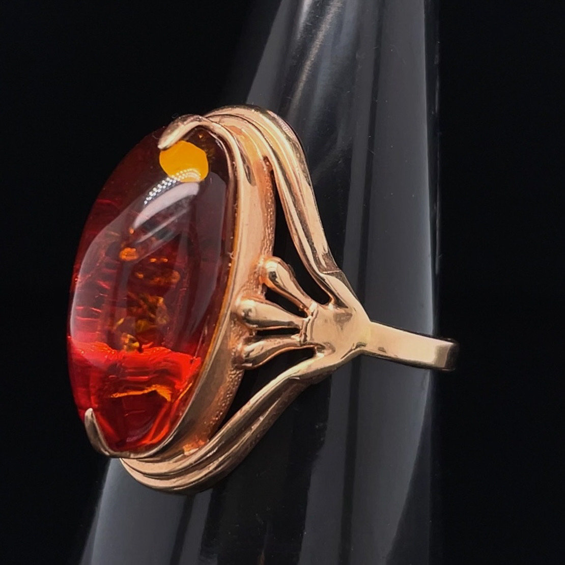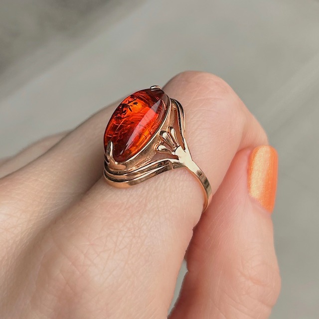 Crafted of 14k rose gold, this antique ring features genuine Russian amber set in a hand-crafted, split shank mounting. We do our best to capture the vibrancy of the stones and metal, though this ring is even more beautiful in person.