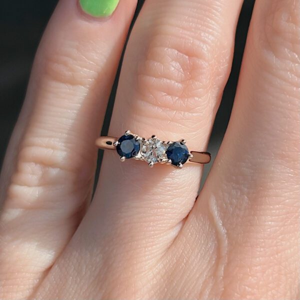 Crafted of 14k yellow gold, this original antique ring features a sparkling natural old European cut diamond in the center, with a genuine sapphire on each side. We do our best to capture the vibrancy of the stones and metal, though this ring is even more beautiful in person. Crafted of 100% recycled metal and stones.