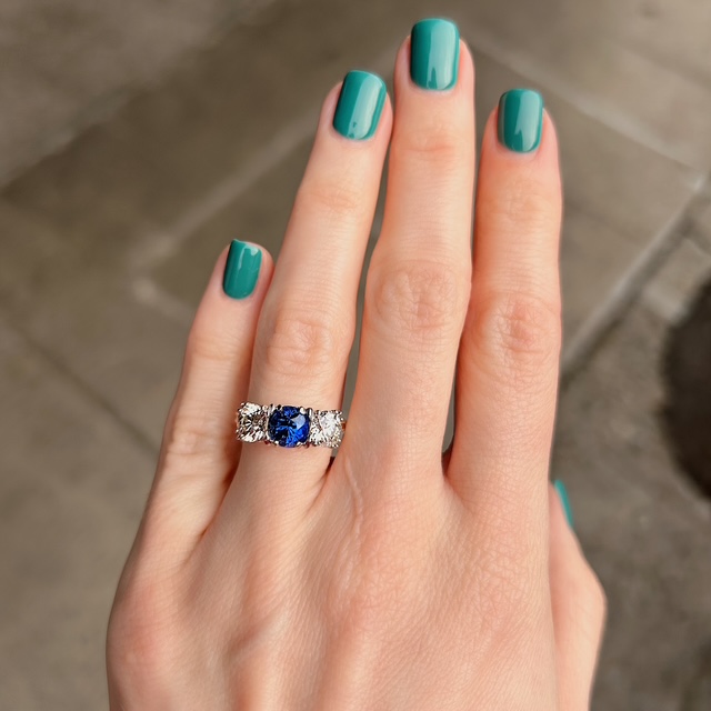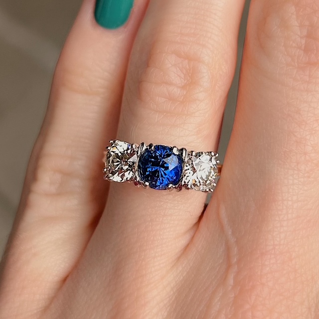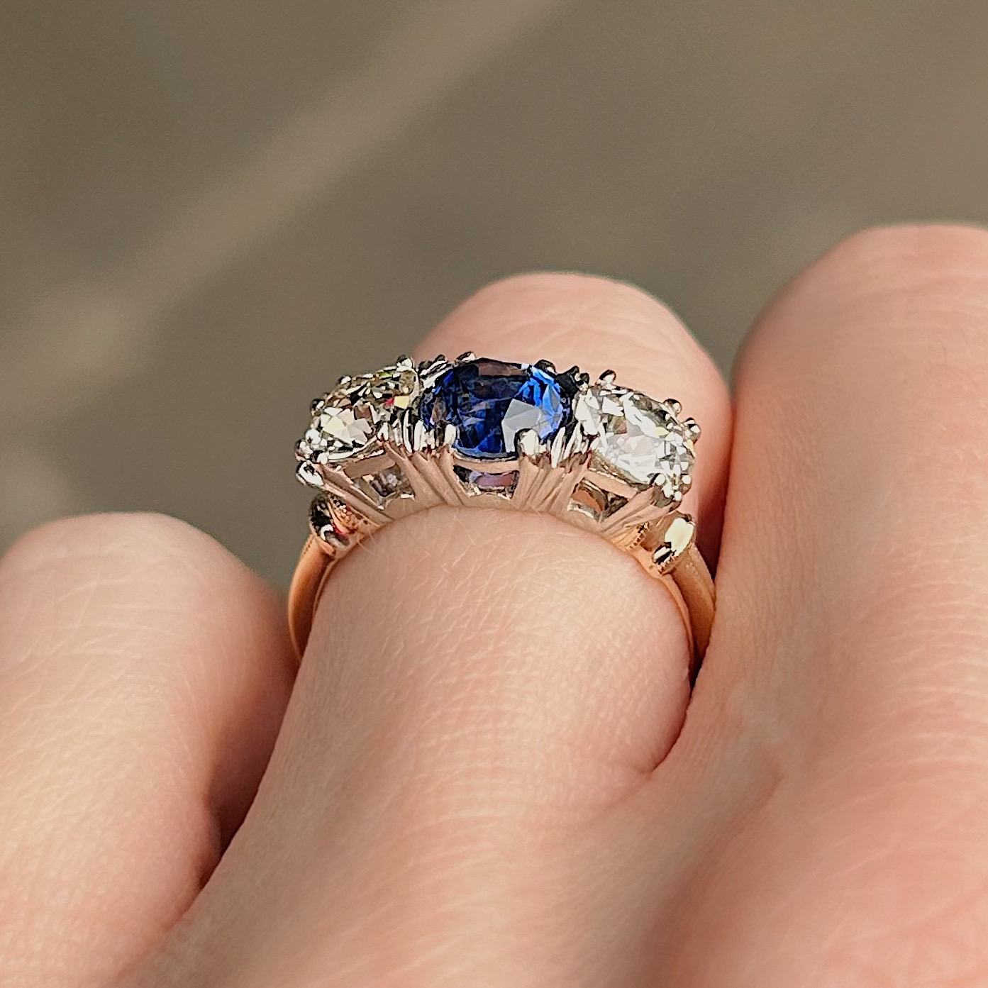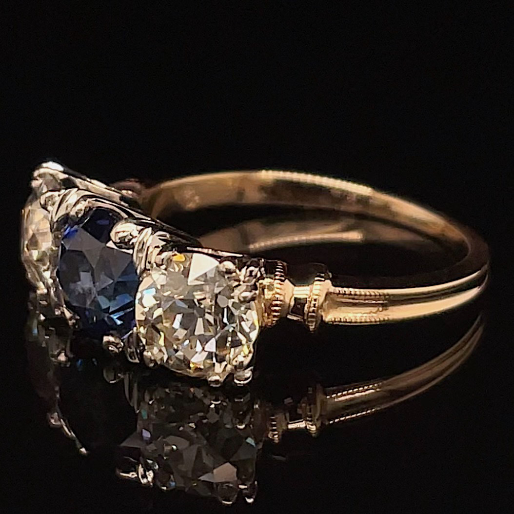 Crafted of 14k yellow gold, this timeless antique three stone ring features a genuine sapphire in the center, with a natural old European diamond on each side. We do our best to capture the vibrancy of the stones and metal, though this ring is even more beautiful in person.