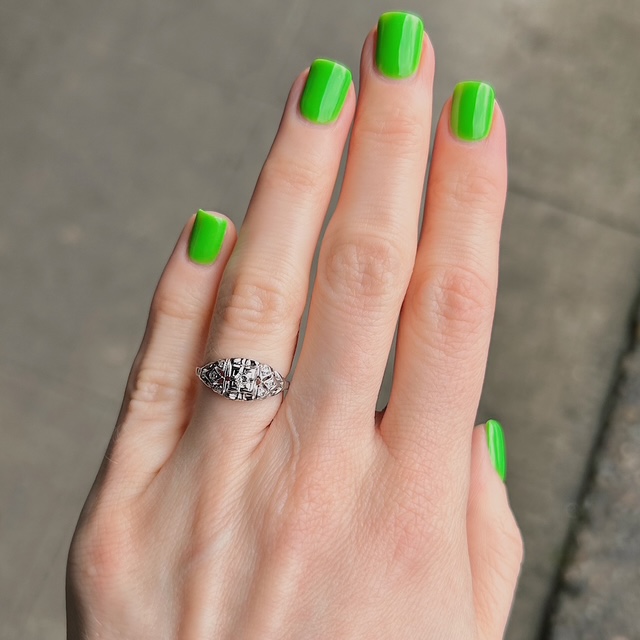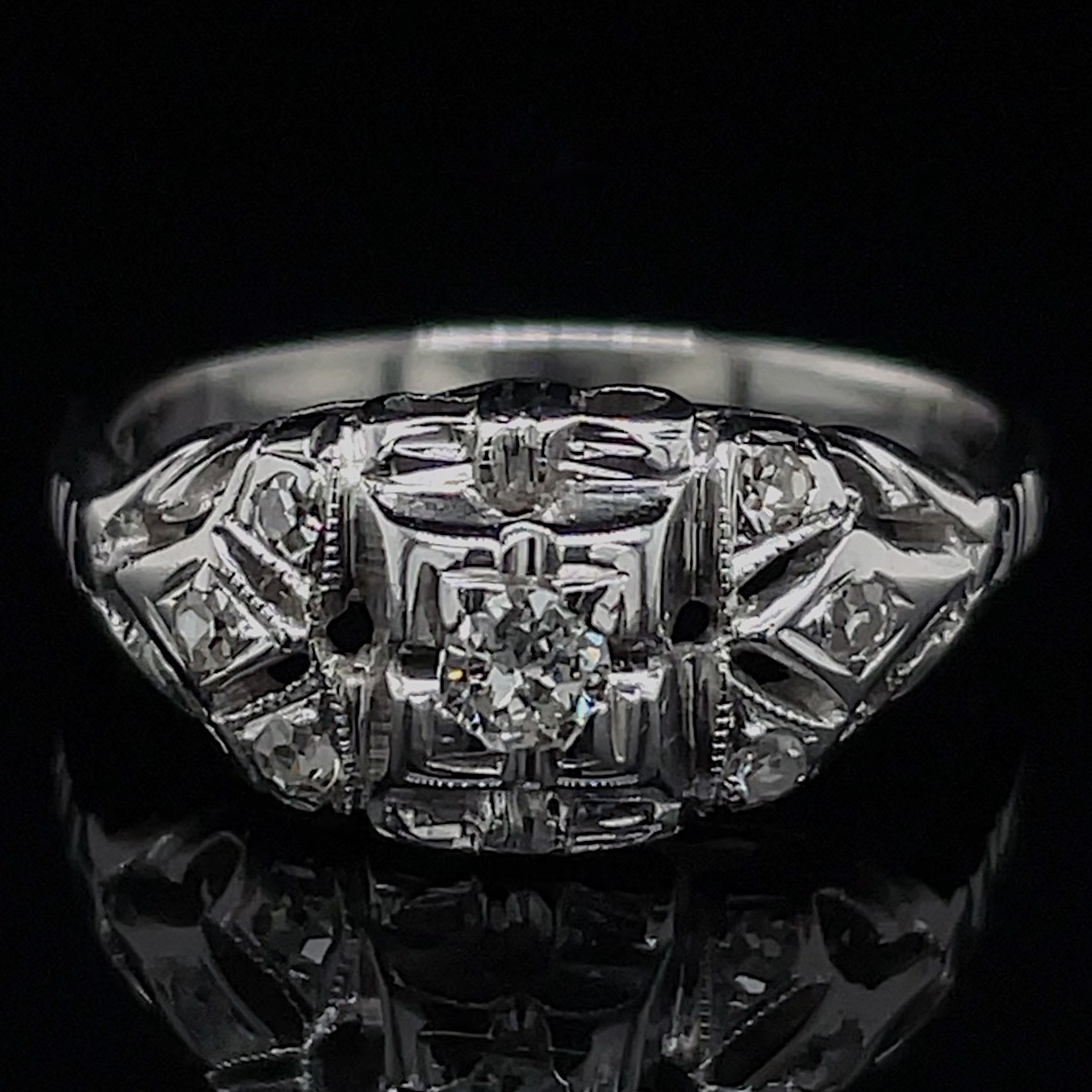 Crafted of 18k white gold, this ring features a natural old European cut diamond in the center, surrounded by single cut diamonds. We do our best to capture the vibrancy of the stones and metal, though this ring is even more beautiful in person.