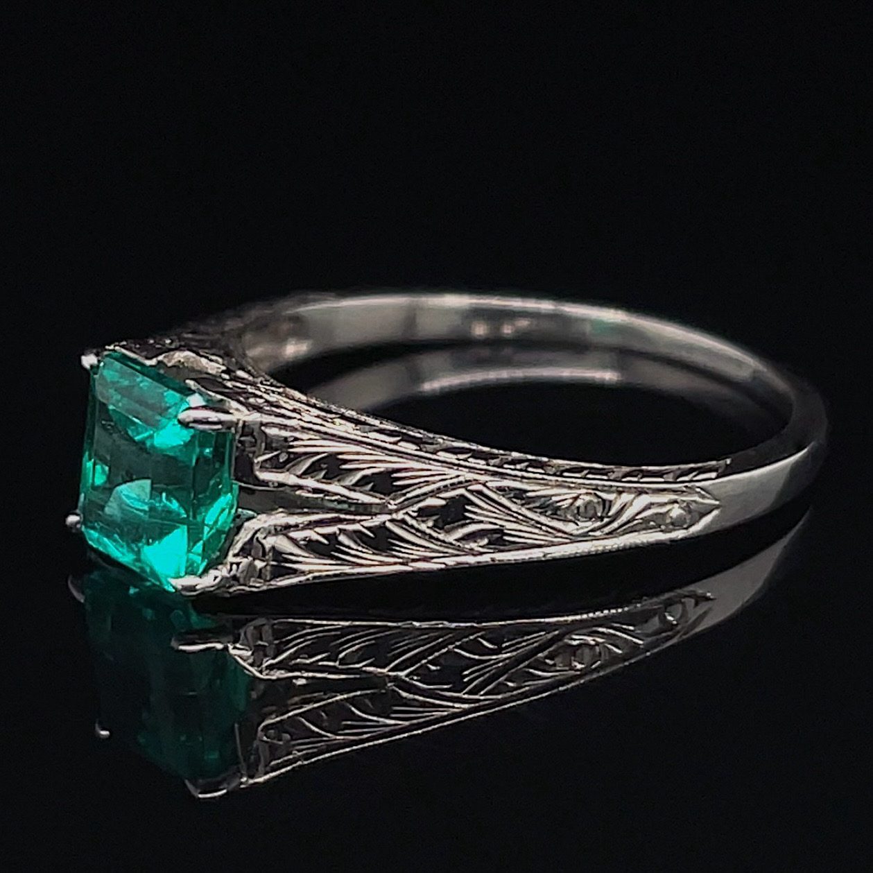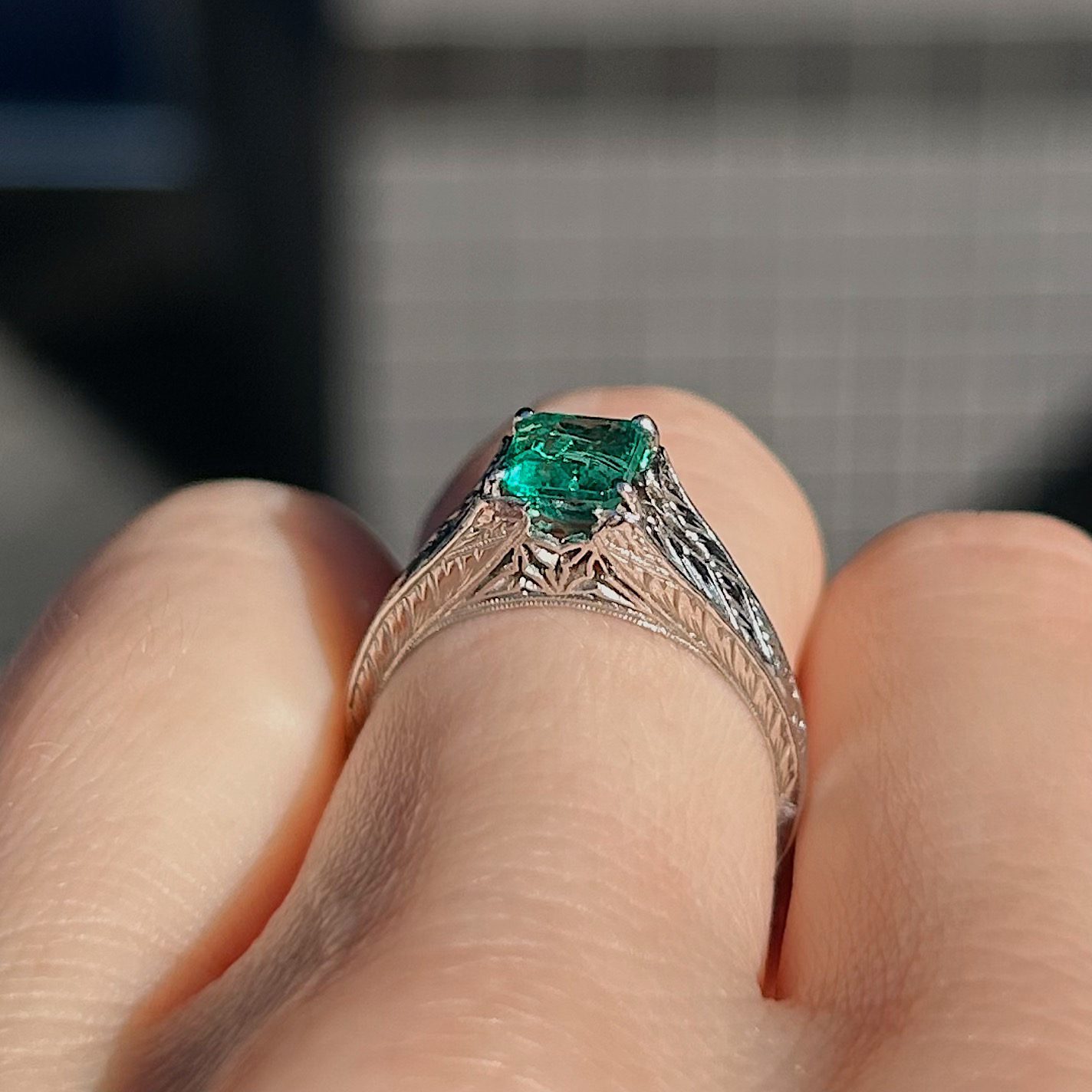 Crafted of platinum, this Art Deco ring features a glowing genuine Colombian emerald in a beautifully detailed hand engraved mounting. We do our best to capture the vibrancy of the stones and metal, though this ring is even more beautiful in person.
