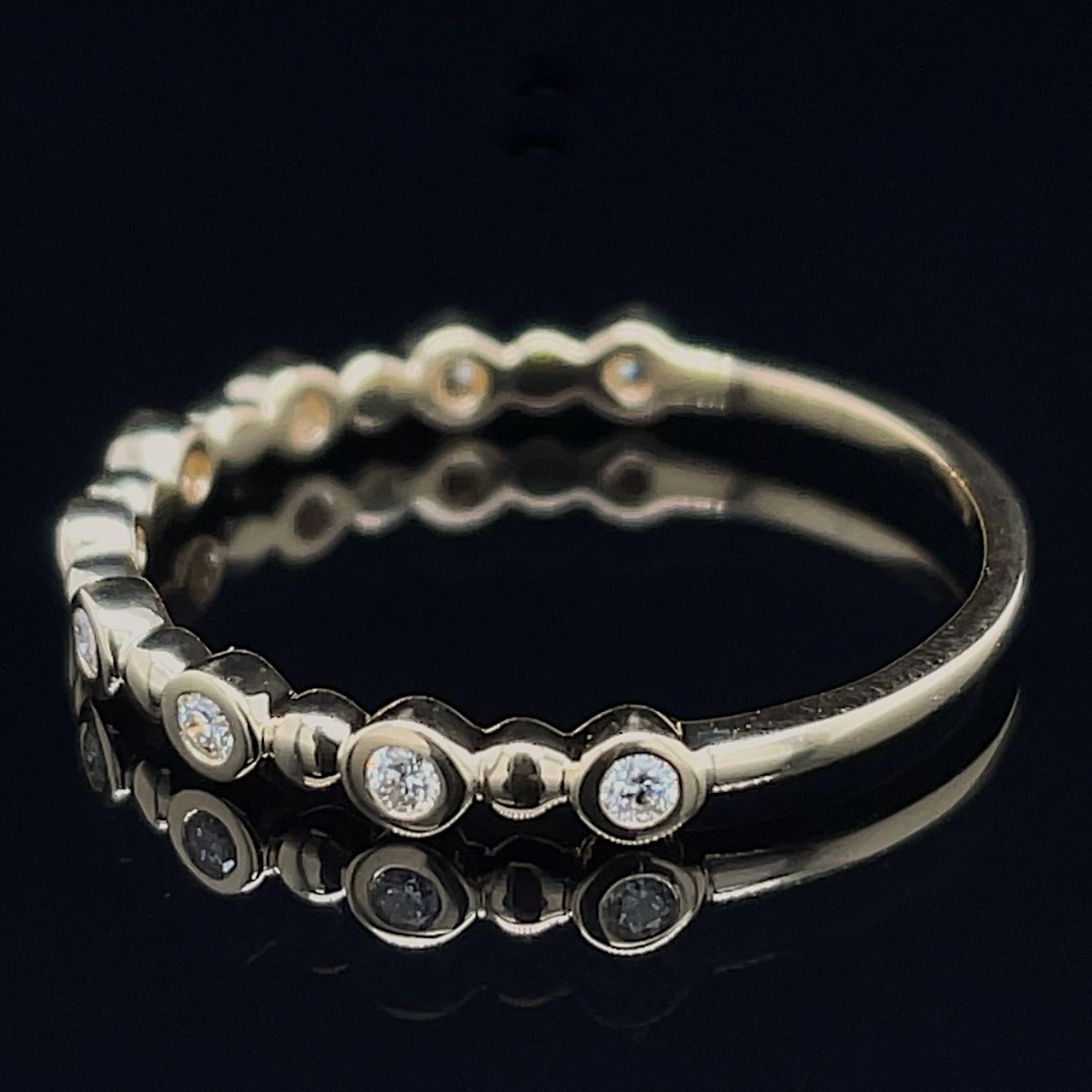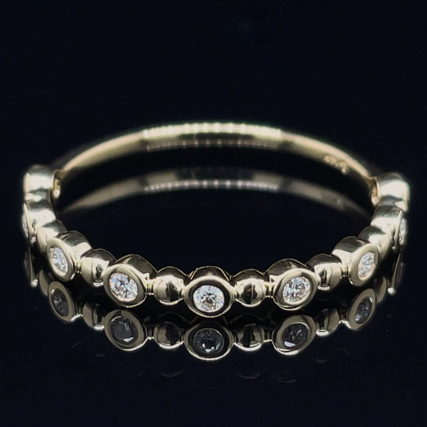 Crafted of 14k yellow gold, this lovely band features natural diamonds set in bezels. Perfect as a wedding band or stacking ring! We do our best to capture the vibrancy of the stones and metal, though this piece looks even better in person! Crafted of 100% recycled metal and stones.