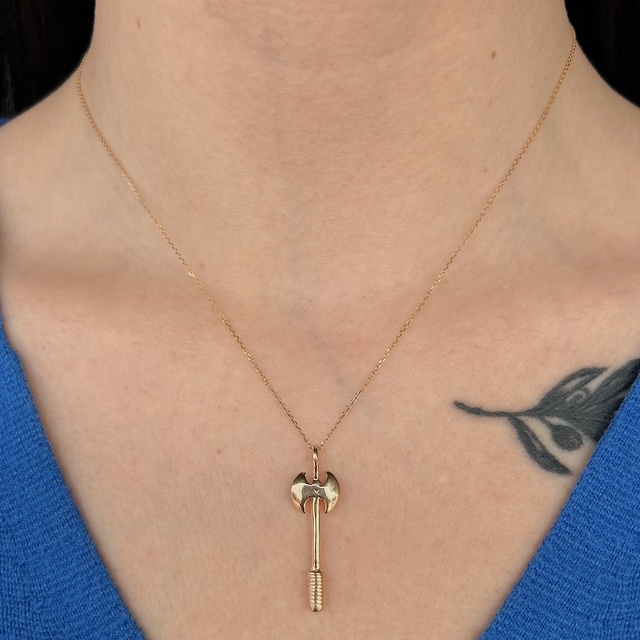 Crafted of 14k yellow gold, this one-of-a-kind Minoan axe pendant is sure to turn heads. Inspired by the Minoan civilization of the Bronze Age, this axe represents ingenuity and dedication to a life of hard work. We do our best to capture the vibrancy of the stones and metals, though they look even better in person.