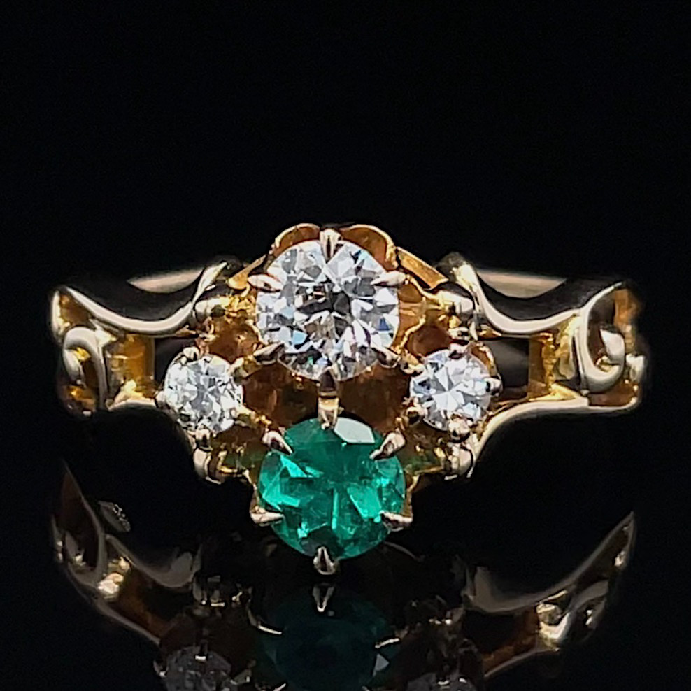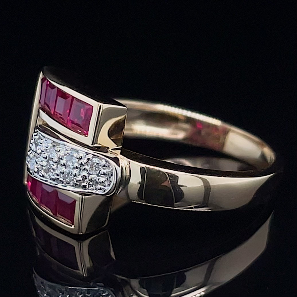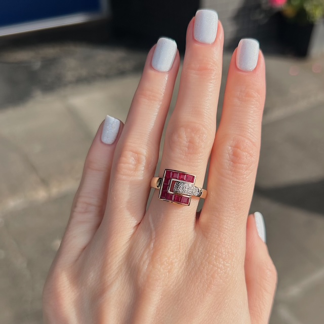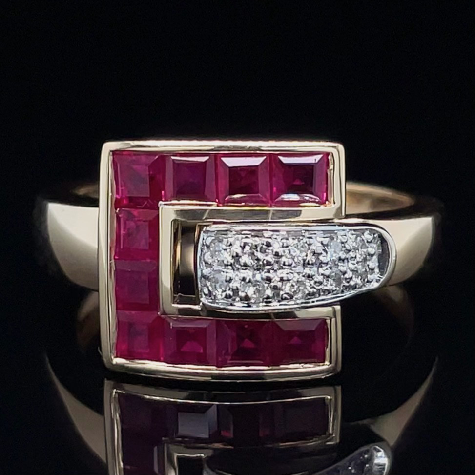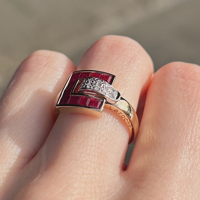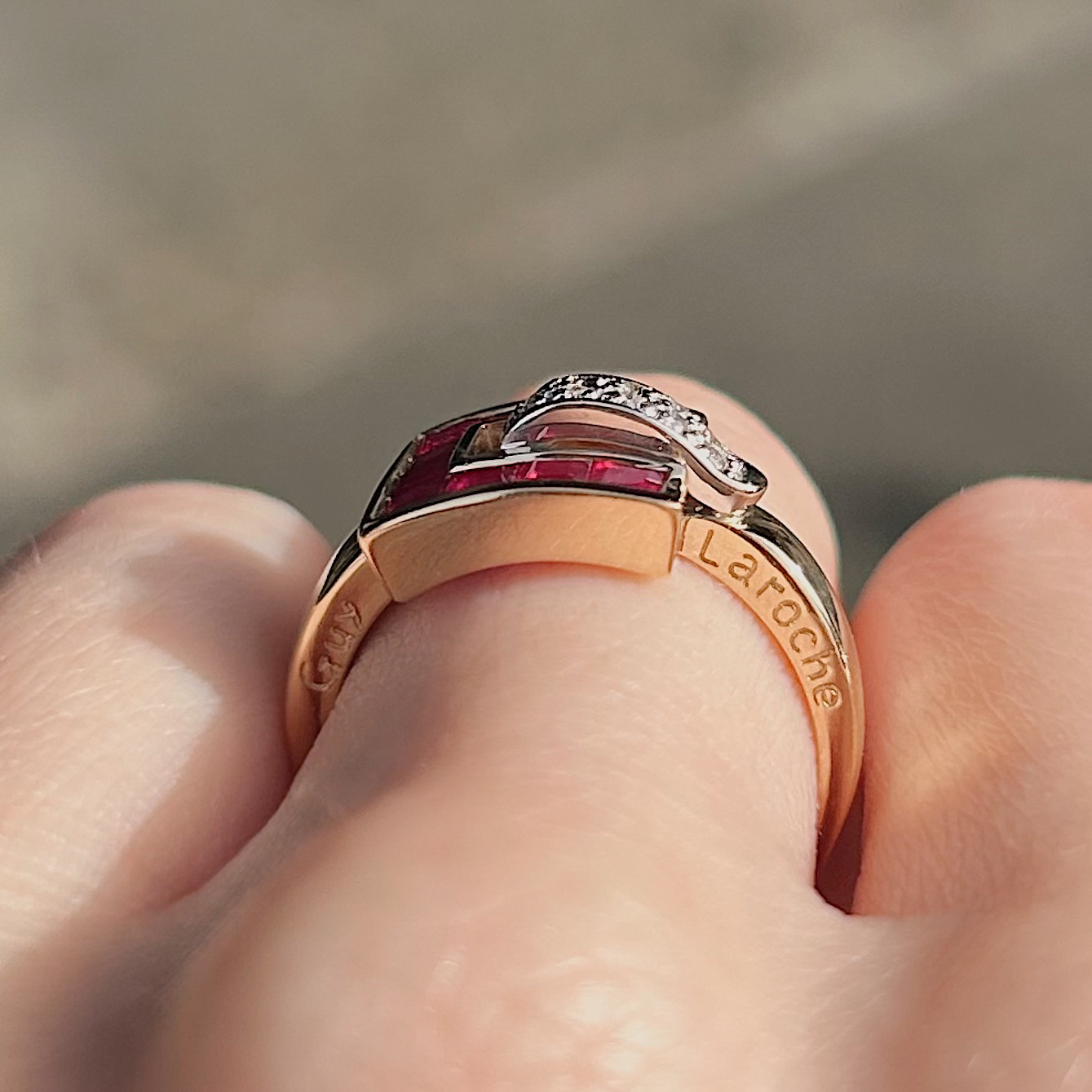 Buckle in, this ring is a beauty! Crafted of 18k yellow gold, this estate Guy LaRoche piece features genuine rubies and sparkling natural diamonds in a fun and funky buckle style setting. We do our best to capture the vibrancy of the stones and metal, though this ring is even more beautiful in person.