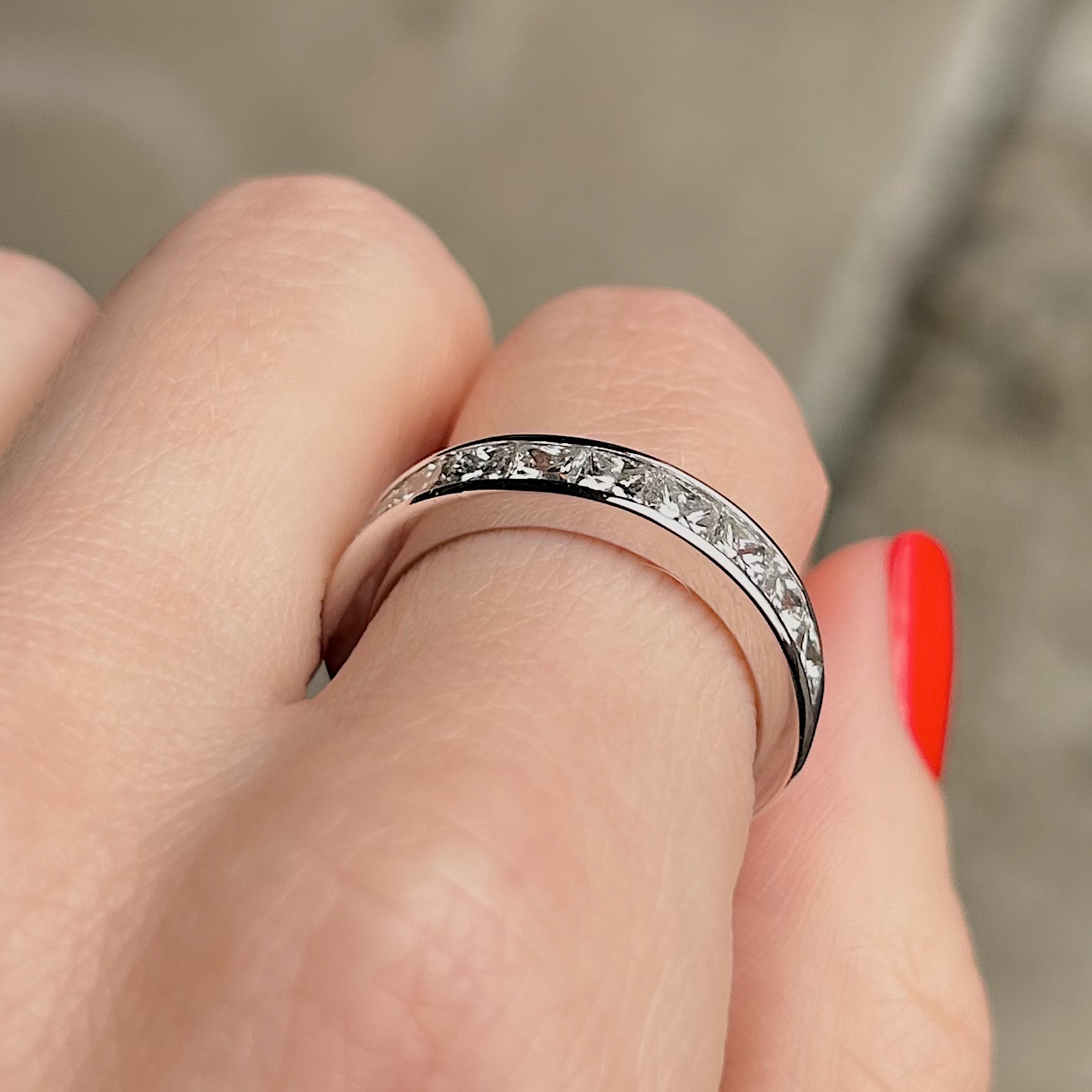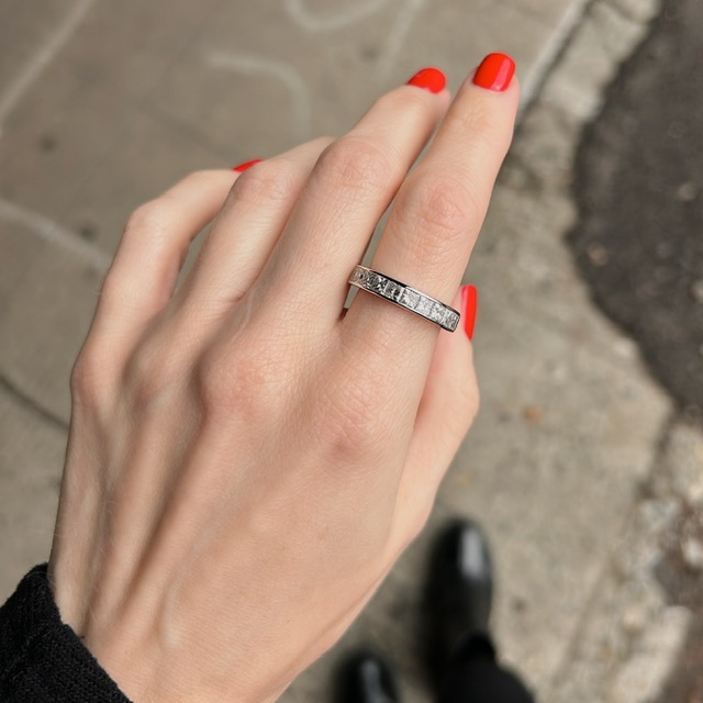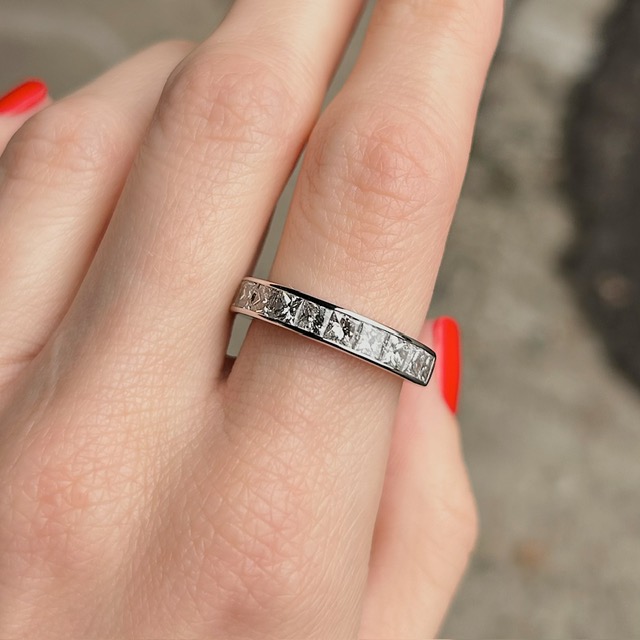 This sweet diamond ring makes for the perfect wedding band or stacking ring! This piece features princess cut diamonds channel set in recycled 14k white gold. We do our best to capture the vibrancy of the stones and metal, though this piece looks even better in person!