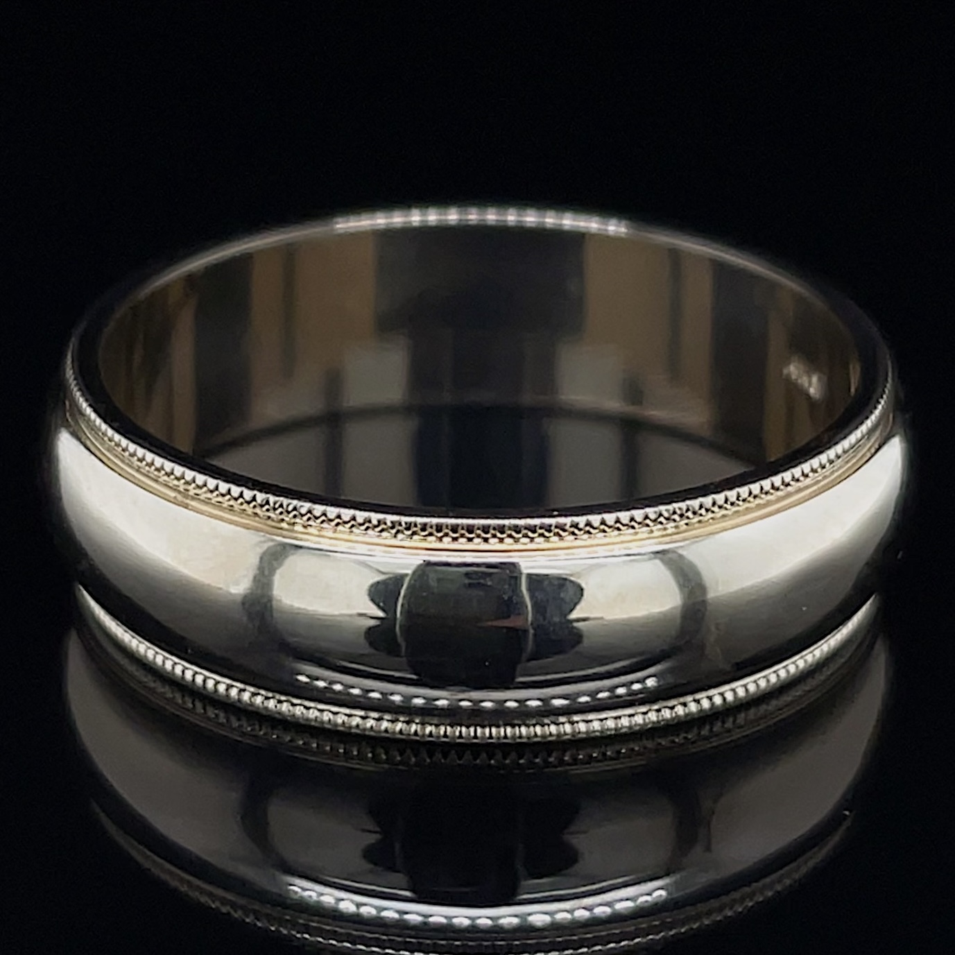 Crafted of 14k yellow gold, this estate band features a high polish center with milgrain edges. This is perfect as a unique wedding band. This ring is 6mm wide, is a size 10, and can be sized up or down. The first sizing is complimentary. We do our best to capture the vibrancy of the design and metal, though this piece looks even better in person.