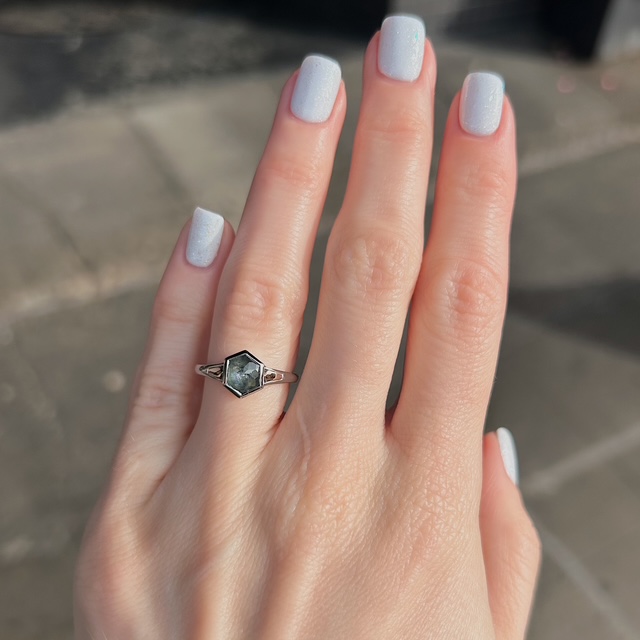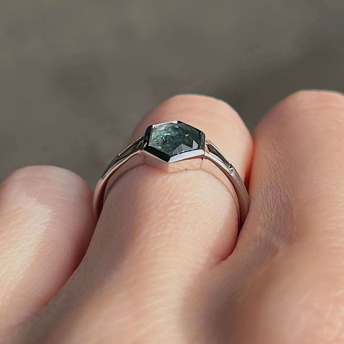 Crafted of platinum and 14k rose gold, this estate ring features a genuine hexagon shape, rose cut Montana sapphire set in a bezel. We do our best to capture the vibrancy of the stones and metal, though this ring is even more beautiful in person.