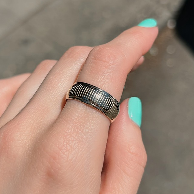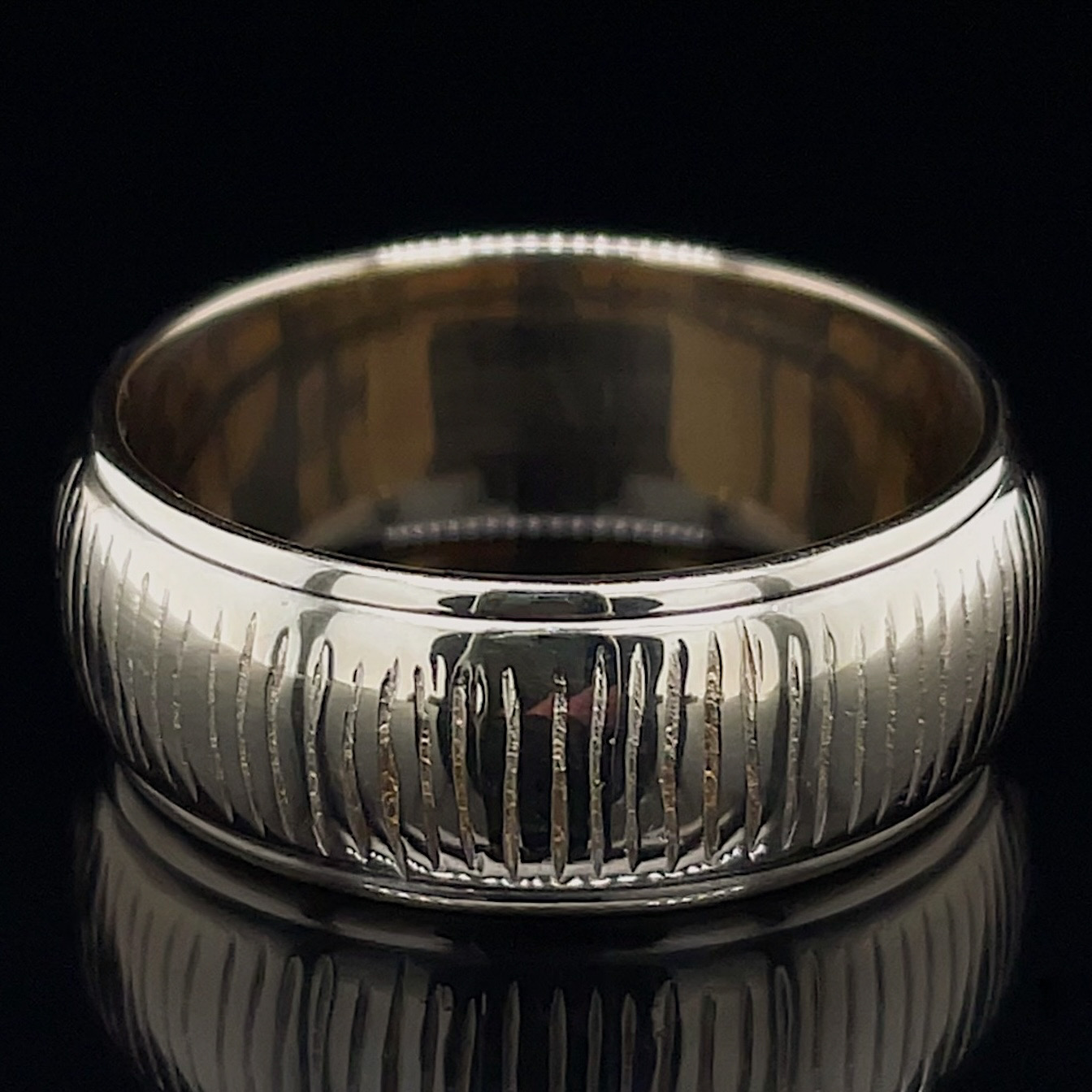 Crafted of 14k yellow gold, this 8mm wide estate band features a ridged design and is a ring size 9, and can be sized up or down. The first sizing is complimentary. We do our best to capture the vibrancy of the design and metal, though this piece looks even better in person.