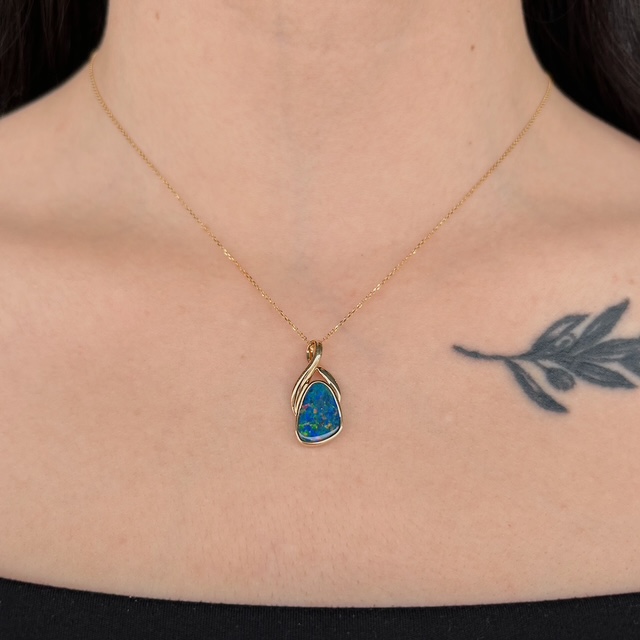 Crafted of 14k yellow gold, this estate pendant features a genuine Australian opal placed in a twisty, freeform setting. Perfect for everyday wear and the fancier occasions in life! We do our best to capture the vibrancy of the stone and metal, though this piece looks even better in person.