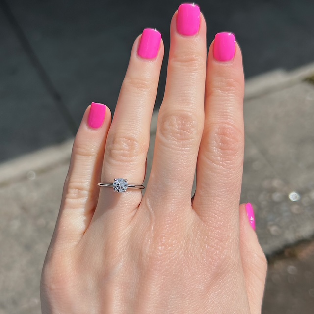 Crafted of platinum, this ring features a natural recycled AGS certified ideal cut round brilliant diamond in the center. We do our best to capture the vibrancy of the stones and metal, though this ring is even more beautiful in person.