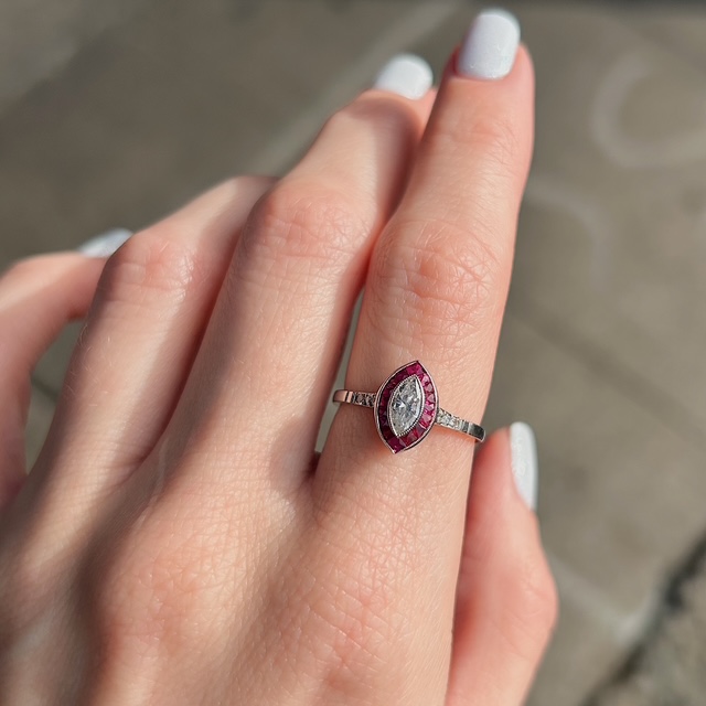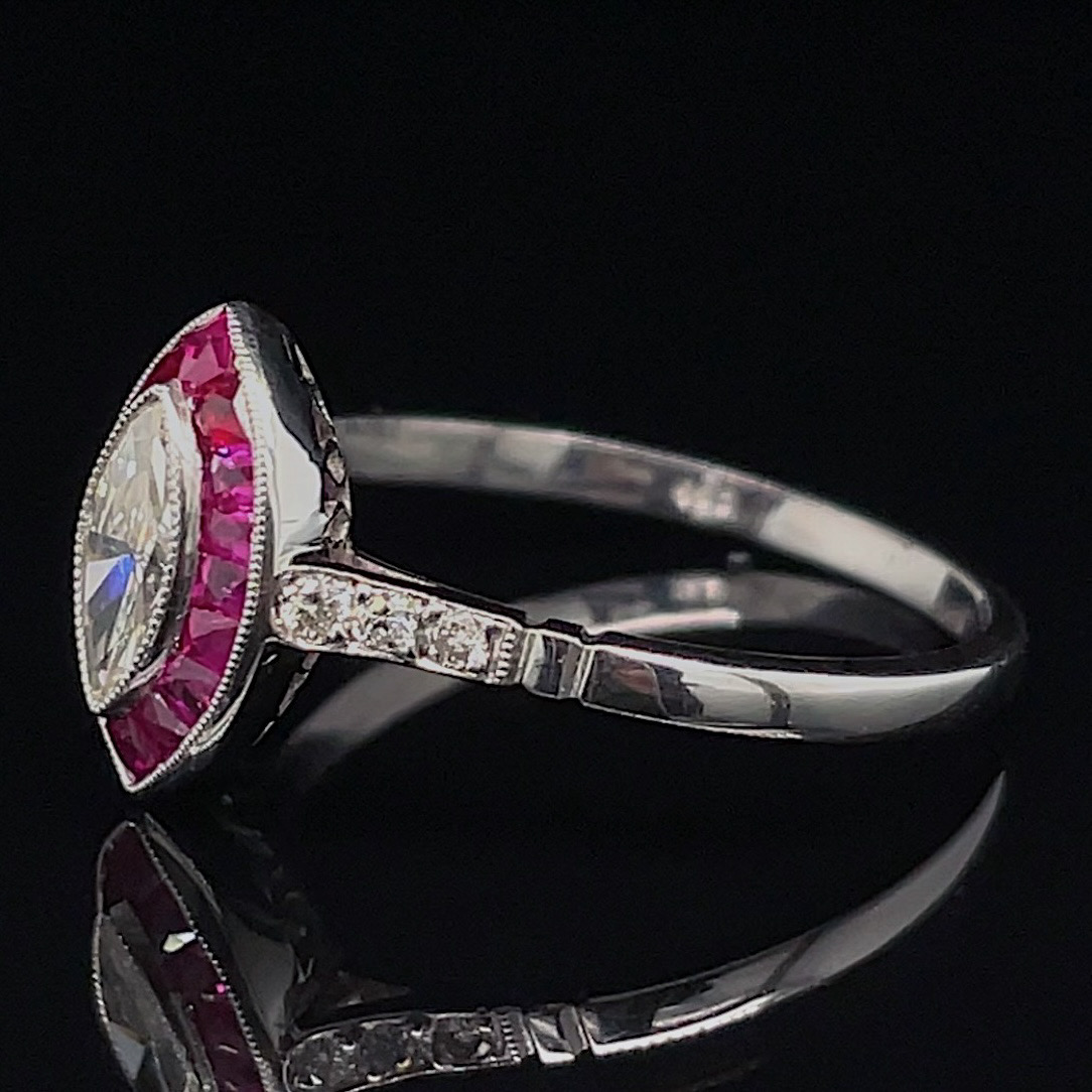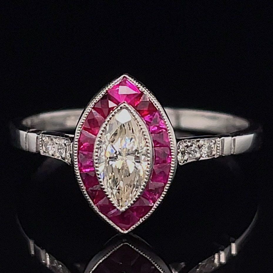 Crafted of platinum, this art deco inspired estate ring features a natural marquise diamond, with beautiful genuine rubies and natural diamond accents. We do our best to capture the vibrancy of the stones and metal, though this ring is even more beautiful in person.