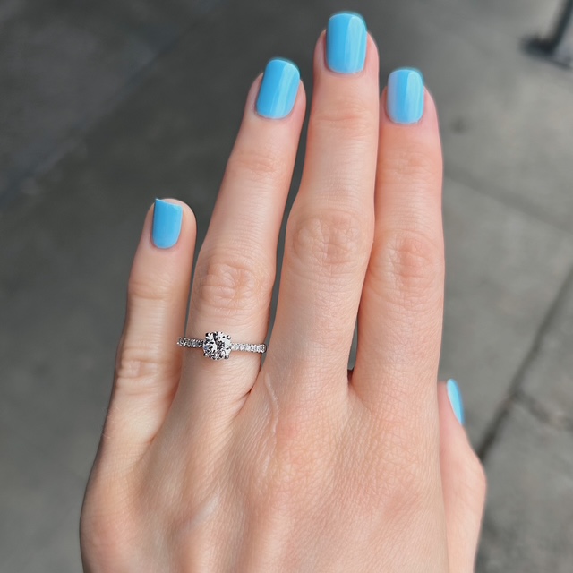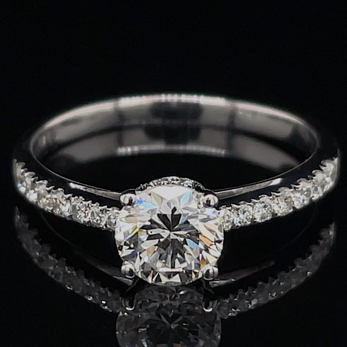Crafted of 18k white gold, this estate ring features a natural round brilliant diamond in the center, with sparkling round brilliant diamonds down the band. We do our best to capture the vibrancy of the stones, though they are even more beautiful in person.