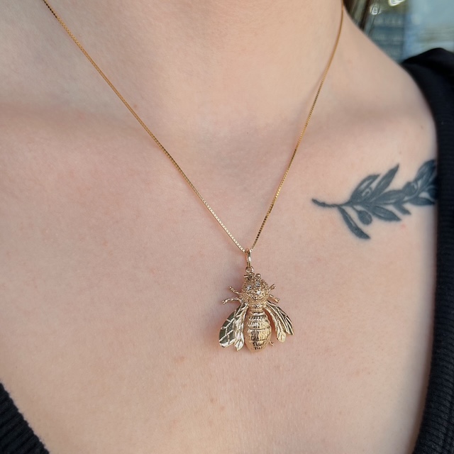 Crafted of 14k yellow gold, this fun estate bee pendant features natural diamond accents. Perfect for every day wear and the fancier occasions in life. We do our best to capture the vibrancy of the stones and metal, though this piece is even more beautiful in person!