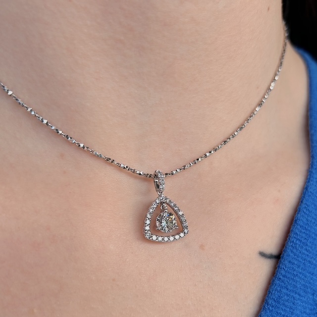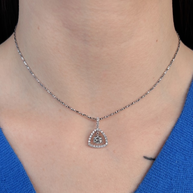 Crafted of 18k white gold, this glimmering pendant features a gorgeous natural round brilliant diamond floating in a triangular halo of even more sparkling natural round brilliant diamonds. Perfect for everyday wear and the fancier occasions in life! We do our best to capture the vibrancy of the stone and metal, though this piece looks even better in person.