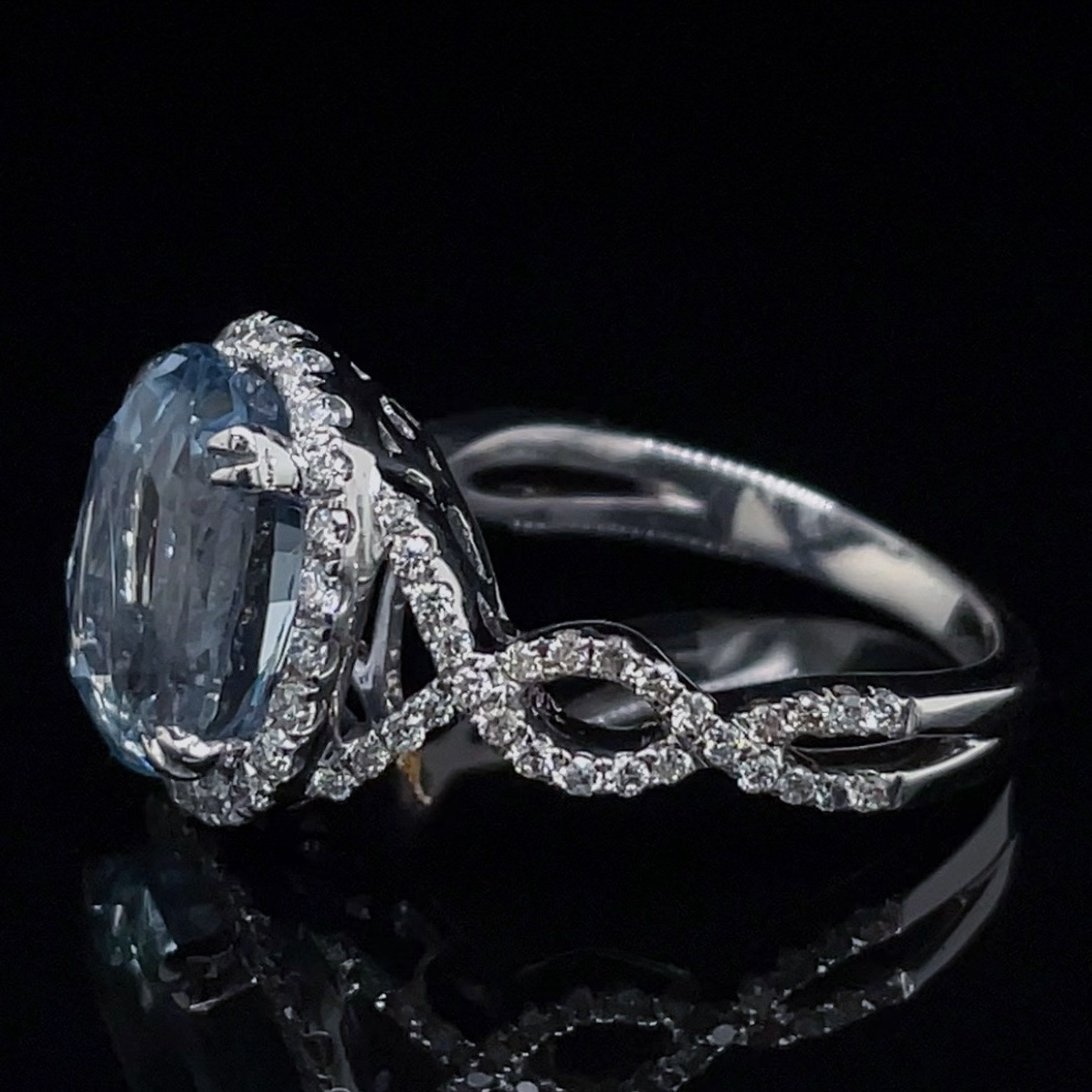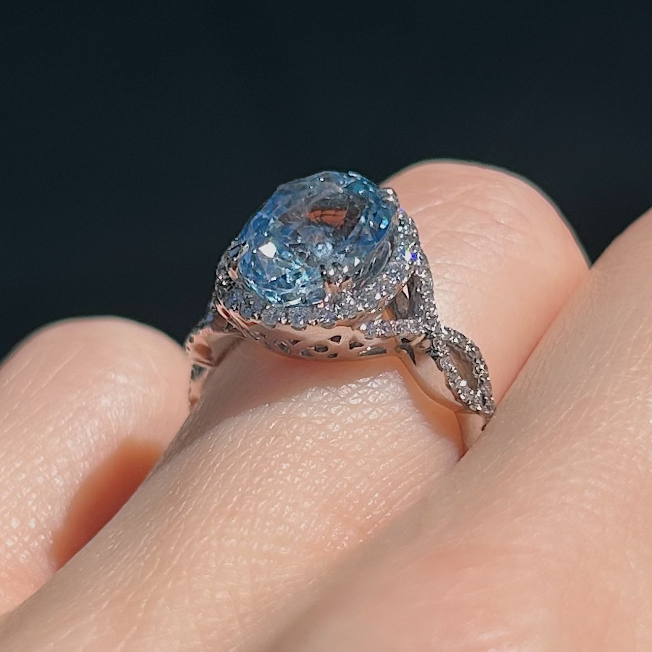 Crafted of 18k white gold, this estate ring features a beautiful light blue, GIA certified, no heat Madagascar sapphire in the center, surrounded by a halo of natural accent diamonds, and diamonds on a twisty band. Truly one of a kind! We do our best to capture the vibrancy of the stones and metal, though this ring is even more beautiful in person.