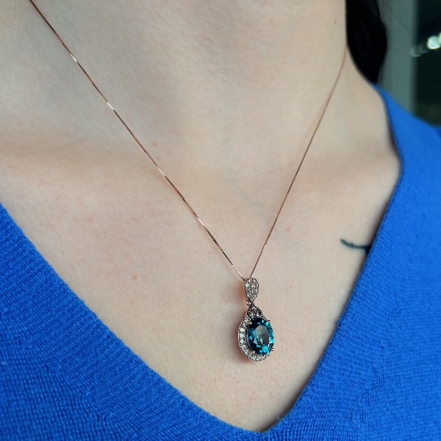 Built to stun and perfect for any occasion! Crafted of 14k rose gold, this estate LeVian pendant features glowing blue topaz and natural round brilliant diamonds. We do our best to capture the vibrancy of the stones and metal, though these earrings are even more beautiful in person.