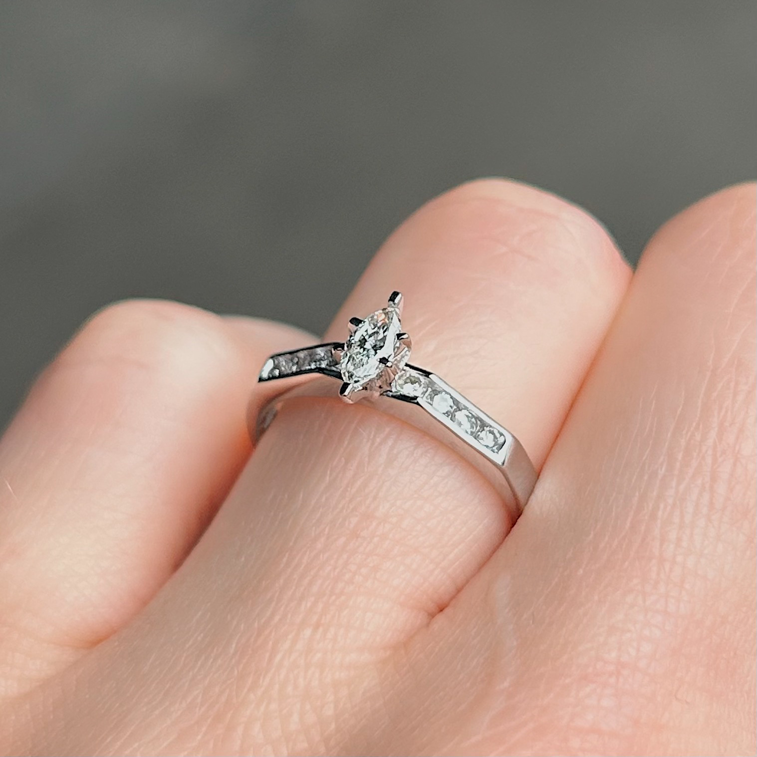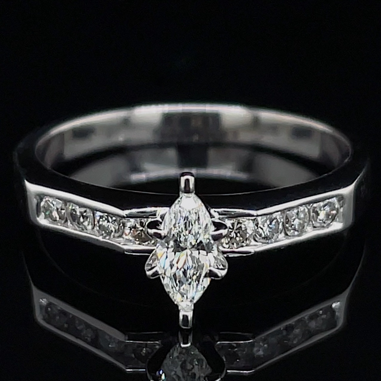 Crafted of 14k white gold, this ring features a beautiful natural marquise diamond in the center, with round brilliant diamonds down the band. We do our best to capture the vibrancy of the stones and metal, though this ring is even more beautiful in person.