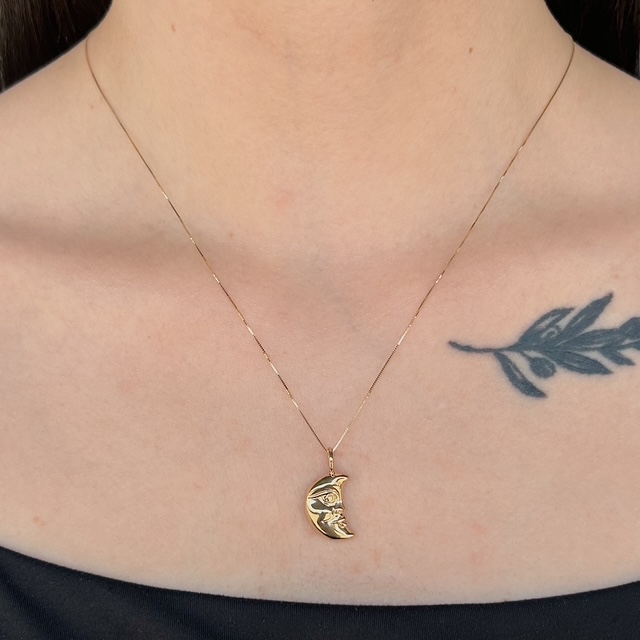 Crafted of 14k yellow gold, this estate pendant features a whimsical moon face on a new gold chain. We do our best to capture the vibrancy of the metal, though this piece looks even better in person.