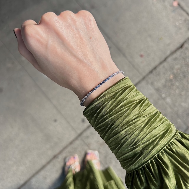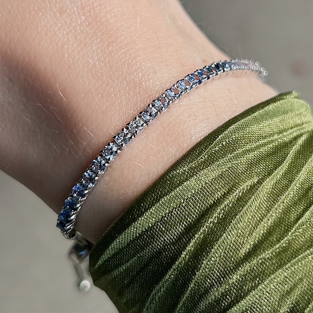 Crafted of 14k white gold, with genuine sapphire gemstones, this estate LeVian bracelet showcases an ombré of beautiful sapphires in a range of blue hues. This bracelet looks great on its own or stacked with other bracelets. Perfect for every day! We try to capture the vibrancy of our pieces in the photos, though this piece is even more beautiful in person.