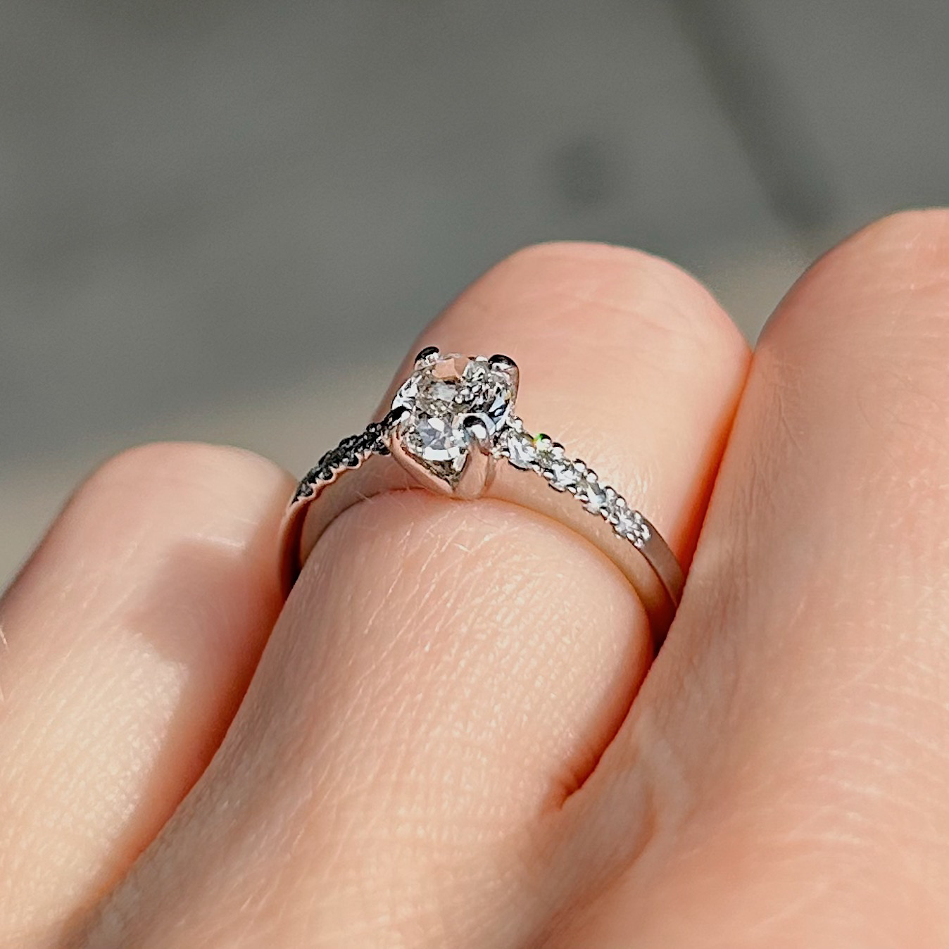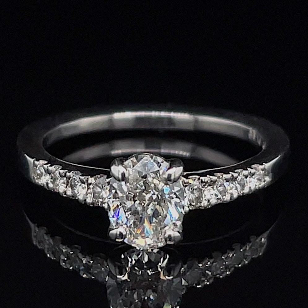 Crafted of platinum, this ring features a beautiful natural oval diamond in the center, with round brilliant diamonds down the band. We do our best to capture the vibrancy of the stones and metal, though this ring is even more beautiful in person.