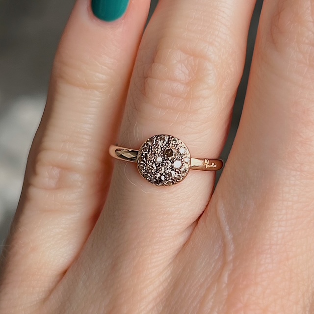 Crafted of 18k yellow gold, this estate Pomellato ring features sparkling natural brown and white diamonds in a fun, unique cluster design. We do our best to capture the vibrancy of the stones and metal, though this ring is even more beautiful in person.