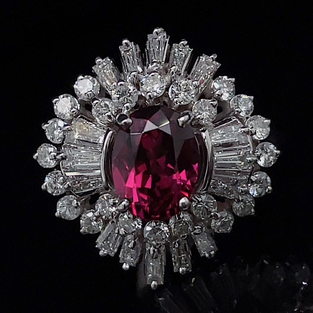 Crafted of 18k white gold, this beautiful ring features a recycled rhodolite garnet surrounded by diamonds, in a timeless ballerina style setting. We do our best to capture the vibrancy of the stones, though they are even more beautiful in person.