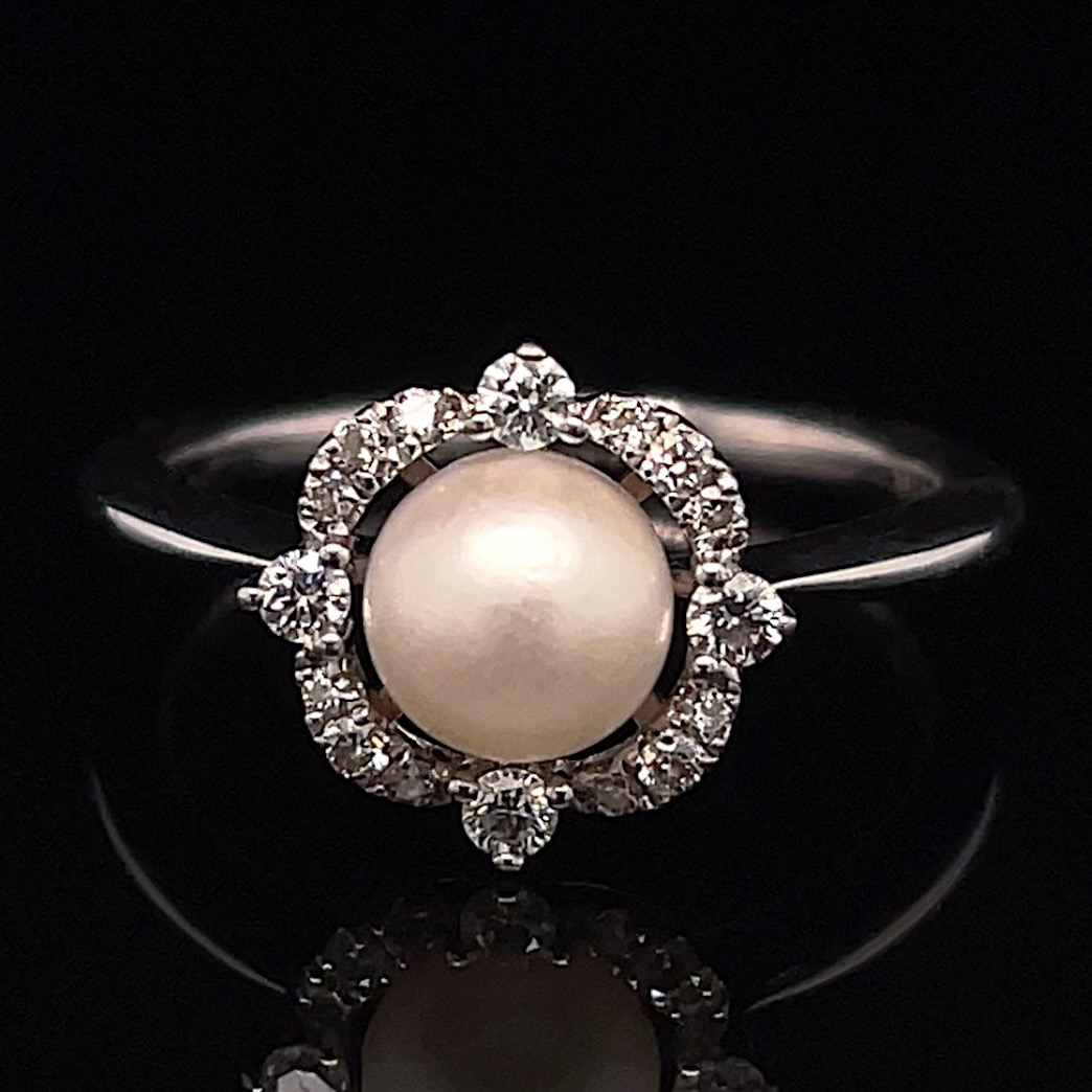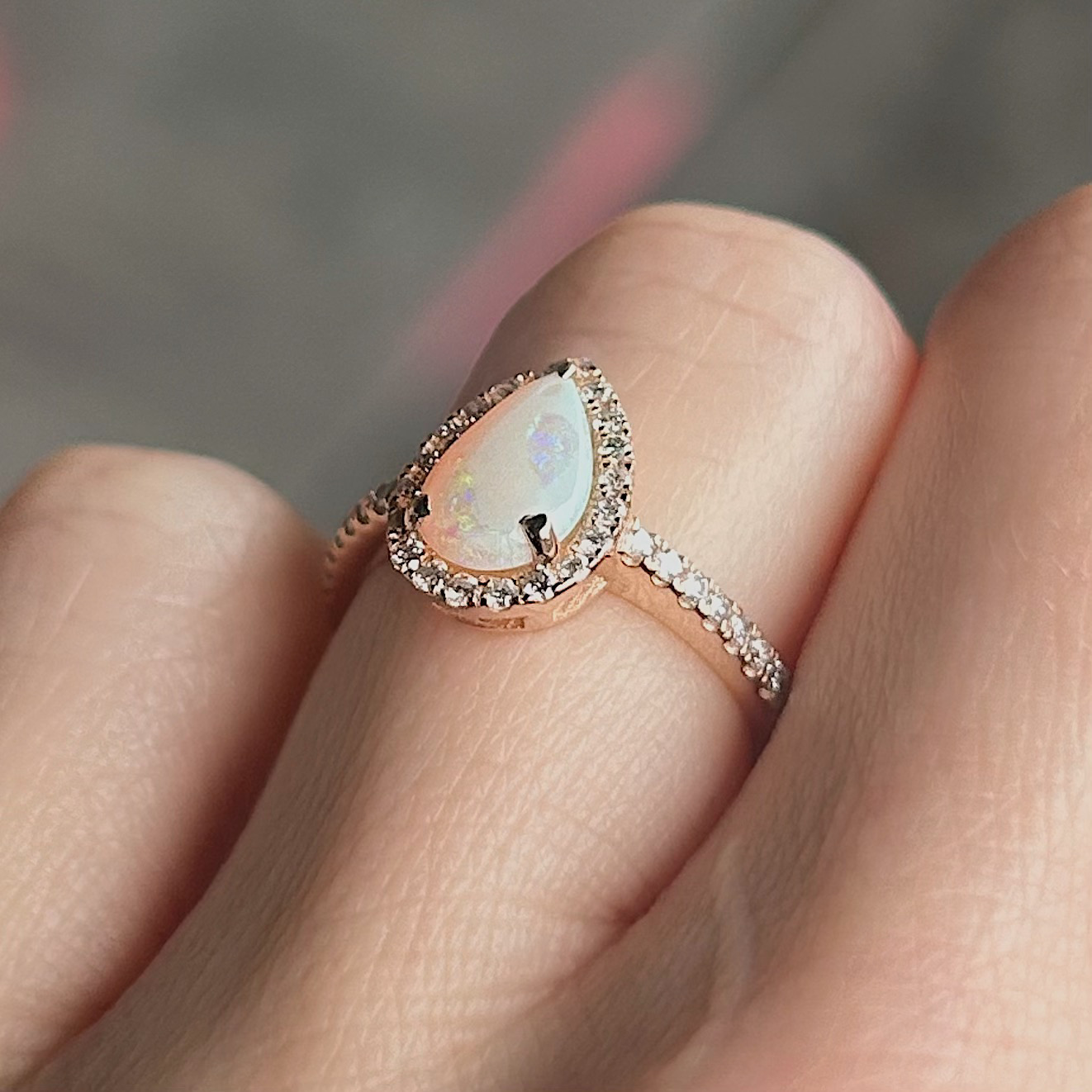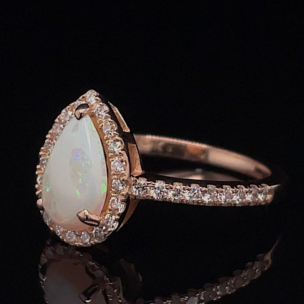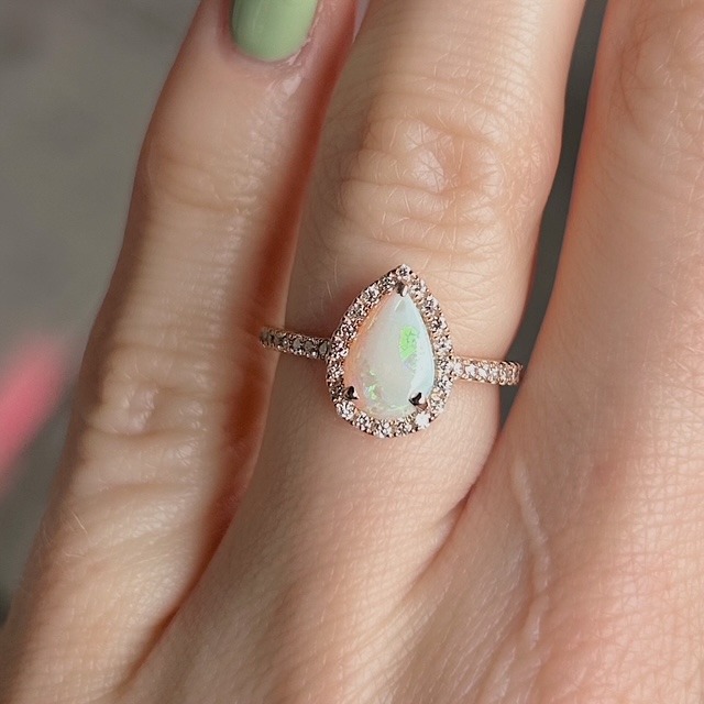 Crafted of 14k rose gold, this estate ring features a genuine opal in the center, with a natural round brilliant diamonds surrounding the center and cascading down the band. Oh so sweet, this ring is cute and petite! We do our best to capture the vibrancy of the stones and metal, though this ring is even more beautiful in person.