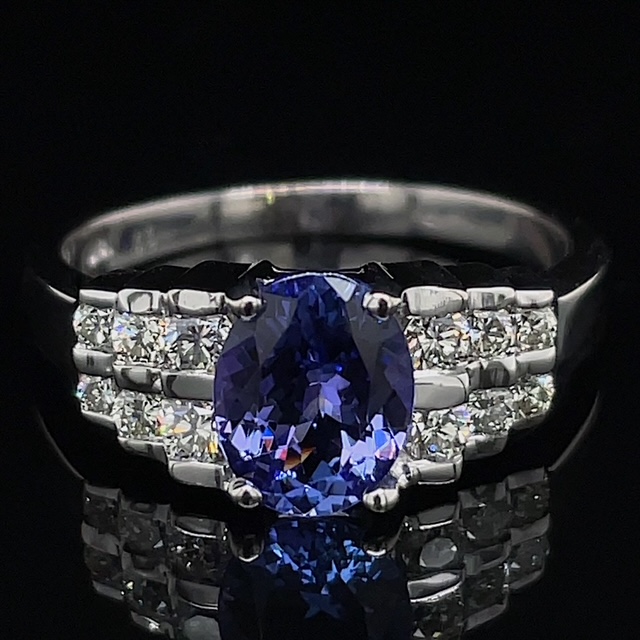 Crafted of 18k white gold, this ring features a genuine tanzanite gemstone, with two rows of sparkling natural diamonds. We do our best to capture the vibrancy of the stones and metal, though this ring is even more beautiful in person.