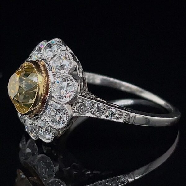 Crafted of platinum, this unique ring features a natural fancy yellow color old mine cut diamond in the center, surrounded by a halo of natural old European cut diamonds, with old European cut diamonds down the band. We do our best to capture the vibrancy of the stones and metal, though this ring is even more beautiful in person. This ring can be sized up or down, and the first sizing is complimentary.