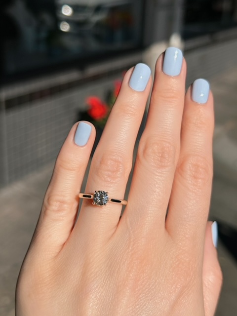 A simple spin on the classic solitaire! The band is crafted of recycled 14K yellow gold and features gorgeous engraved design on each side of the band. One warm sparkling round brilliant diamond is set in a solitaire with “tulip” motif. This is a recycled diamond set in recycled gold. We do our best to capture the vibrancy of the diamond and metal, though this piece is even more beautiful in person.