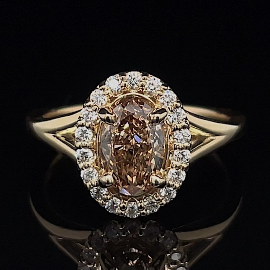 One natural GIA certified oval diamond = 1.01 carats, Fancy orangey-brown color, SI1 clarity.