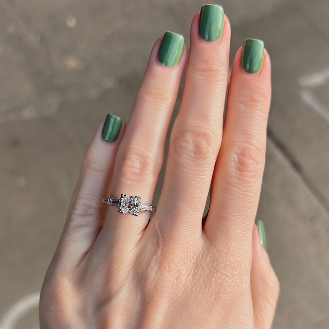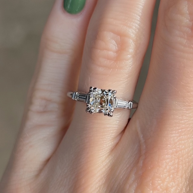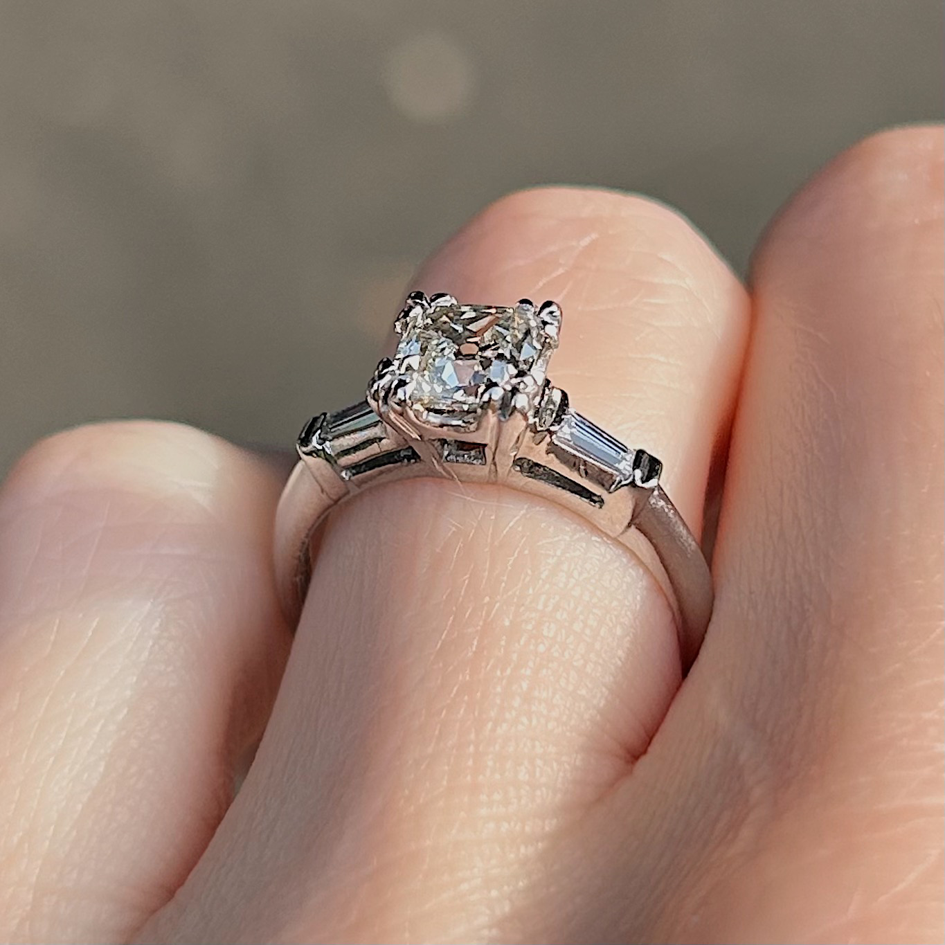 Crafted of platinum, this midcentury diamond ring features a fantastic natural square emerald cut diamond in the center, with sparkling accent baguette cut diamonds on each side . We do our best to capture the vibrancy of the stones, though they are even more beautiful in person.