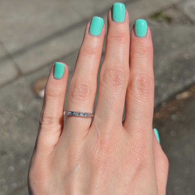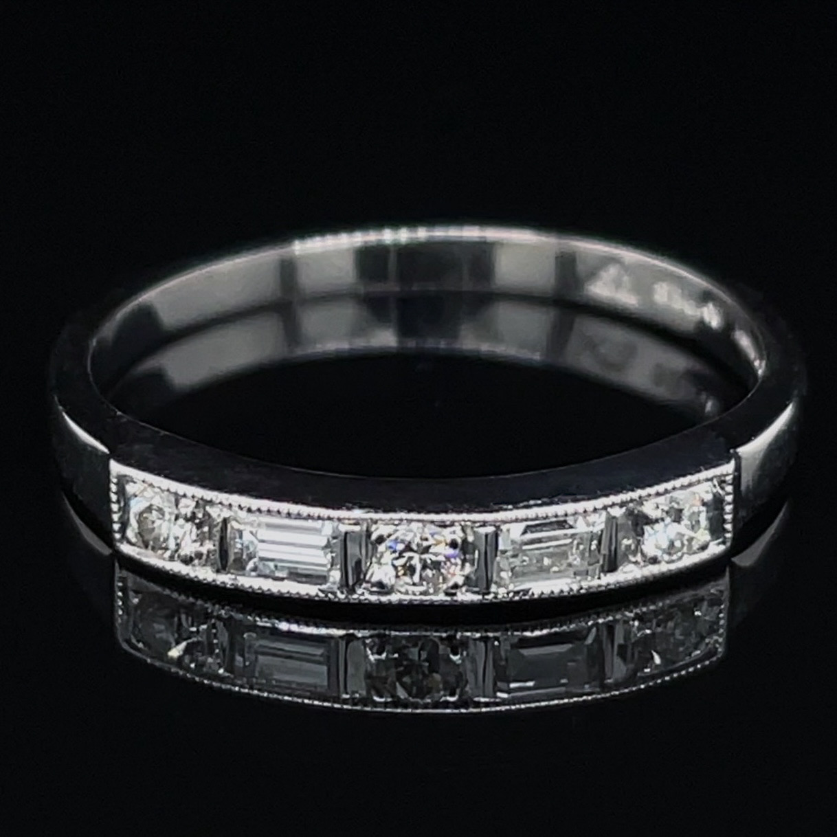 Crafted of platinum, this midcentury band features natural diamonds set in a channel . We do our best to capture the vibrancy of the stones, though they are even more beautiful in person.