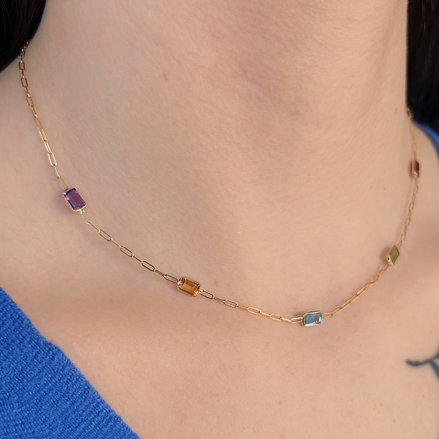 Crafted of 14k yellow gold, this necklace feature genuine bezel set emerald cut multicolor gemstones on a paper clip chain. Perfect for every day wear and the fancier occasions in life! We do our best to capture the vibrancy of the stone and metal, though this piece looks even better in person.