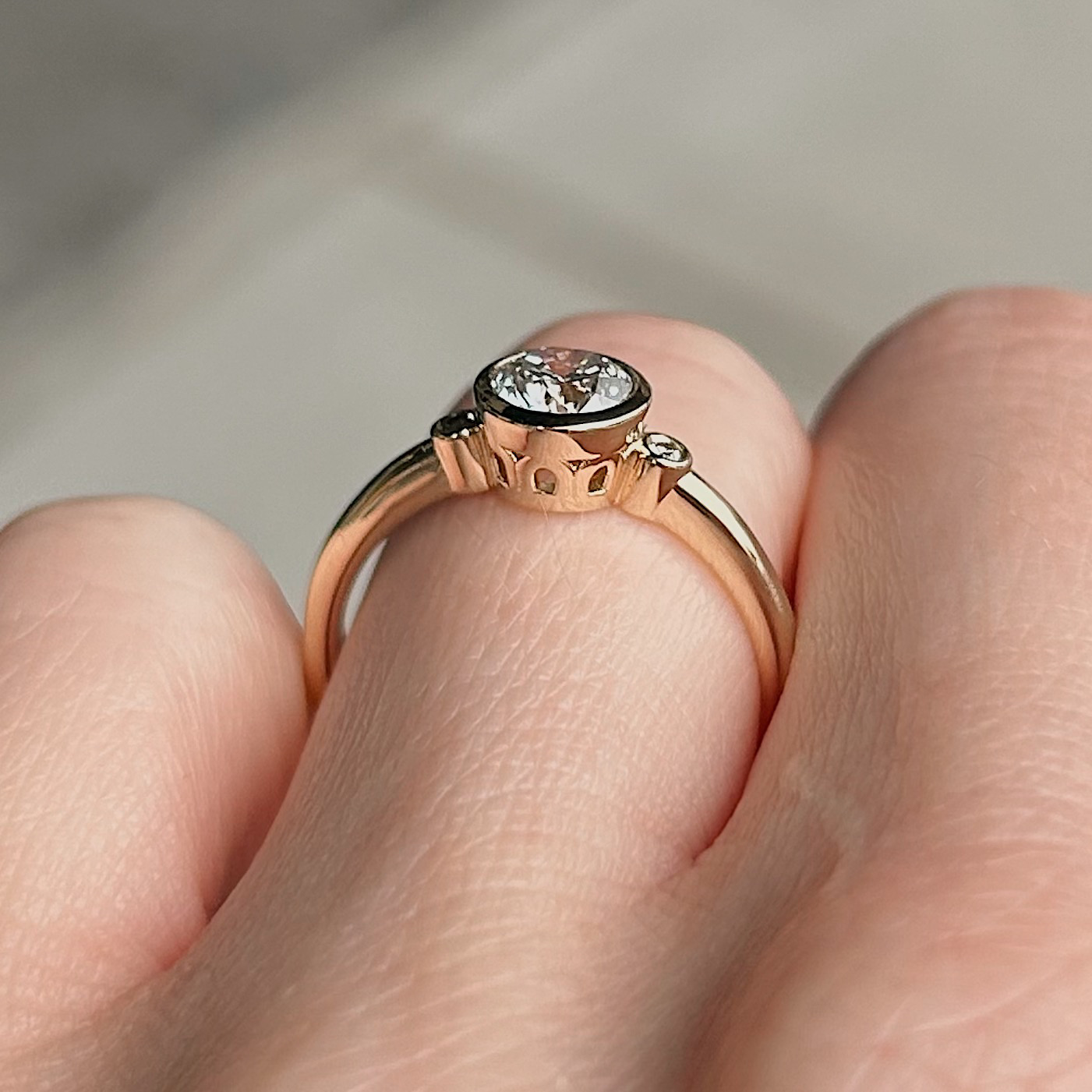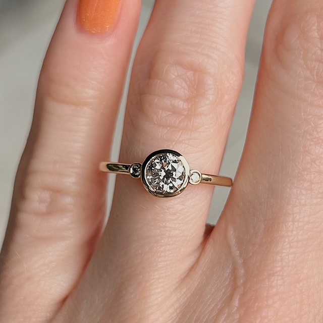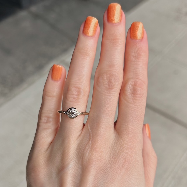 Crafted of 14k yellow gold, this recycled ring features a natural, bezel set fancy brown diamond with a natural round brilliant cut diamond flanked on either side. We do our best to capture the vibrancy of the stones and metal, though this ring is even more beautiful in person.