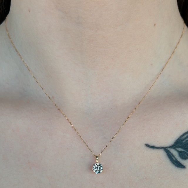 Crafted of 14k yellow gold, this pendant features a recycled natural round brilliant diamond set in three prongs. Perfect for every day wear and the fancier occasions in life. We do our best to capture the vibrancy of the stones and metal, though this piece is even more beautiful in person! Crafted of 100% recycled metal and stones.