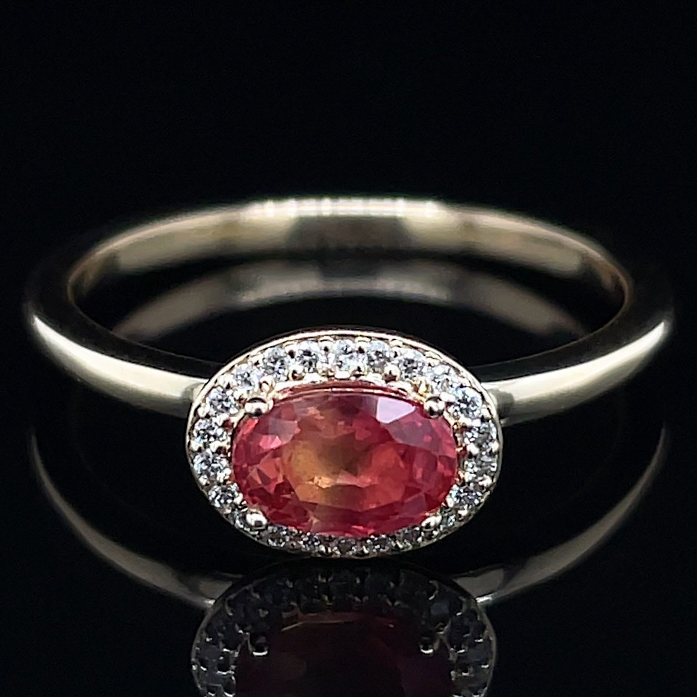 Crafted of 14k yellow gold, this beautiful ring features a genuine oval shape orange sapphire in the center, surrounded by a halo of natural diamonds. We do our best to capture the vibrancy of the stones, though they are even more beautiful in person. Crafted of 100% recycled gemstones and metal.