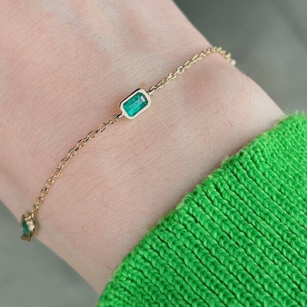 This bracelet is the perfect gift or self purchase! Crafted of 14k yellow gold, it features three sparkling genuine emerald cut emeralds set in bezels. This bracelet looks great on its own or stacked with other bracelets. Perfect for every day! We try to capture the vibrancy of our pieces in the photos, though this piece is even more beautiful in person. Crafted of 100% recycled gemstones and gold.