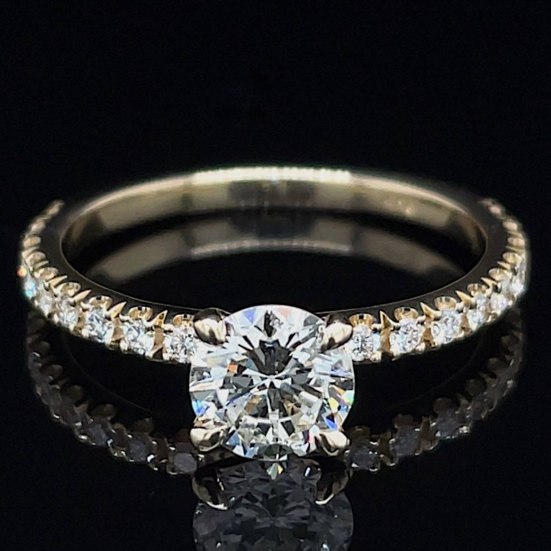 Crafted of 14k yellow gold, this ring features a GIA certified natural round brilliant diamond in the center, with accent diamonds down the band. We do our best to capture the vibrancy of the stones and metal, though this ring is even more beautiful in person.