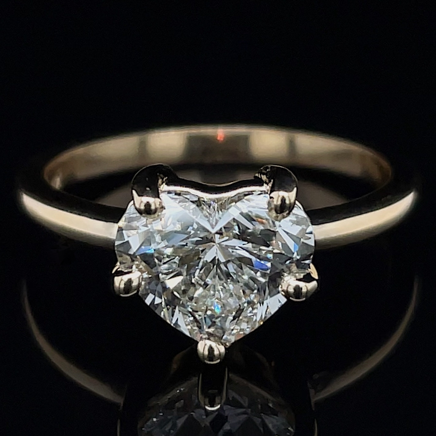 Crafted of 14k yellow gold, this timeless engagement ring features a GIA certified recycled natural heart shape diamond in the center. We do our best to capture the vibrancy of the stones and metal, though this ring is even more beautiful in person.