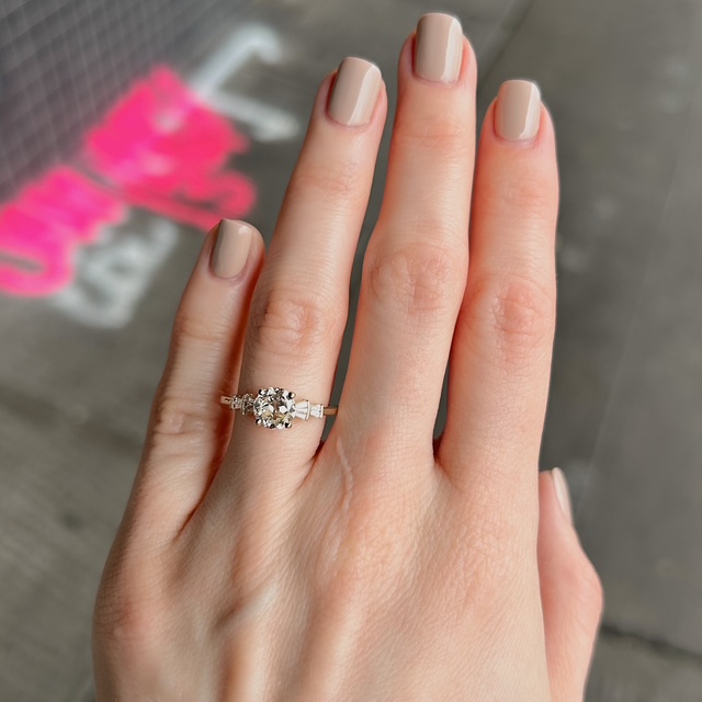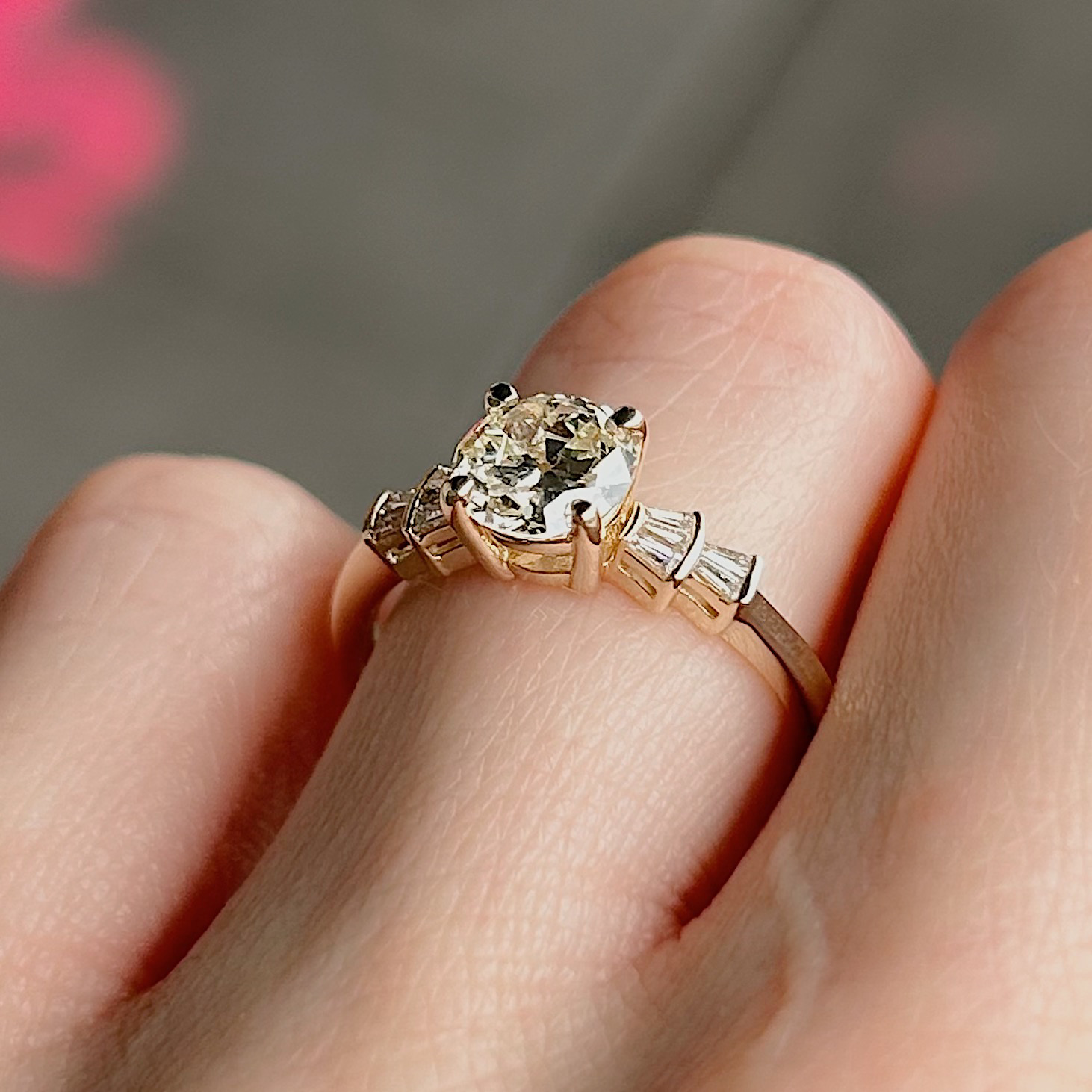 Crafted of 14k yellow gold, this vintage inspired ring features a GIA certified natural old European cut diamond, with baguettes on each side in a deco-style fan motif. We do our best to capture the vibrancy of the stones and metal, though this ring is even more beautiful in person.