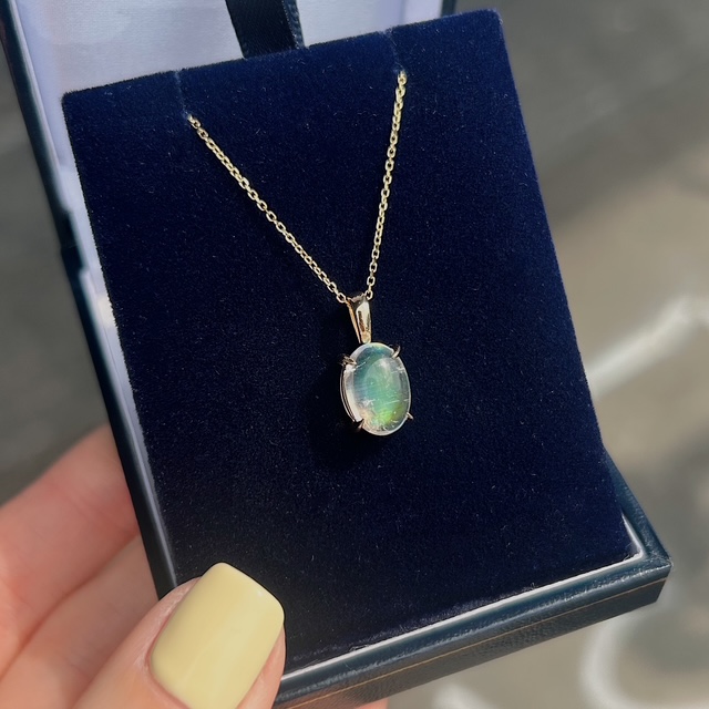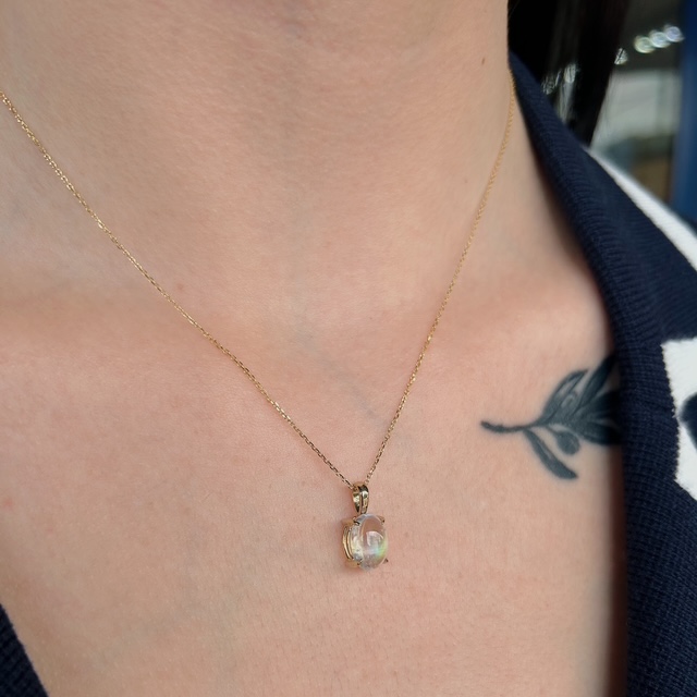 Crafted of 14k yellow gold, this beautiful pendant features a genuine oval moonstone set in four prongs. Perfect for every day wear and the fancier occasions in life. We do our best to capture the vibrancy of the stones and metal, though this piece is even more beautiful in person!