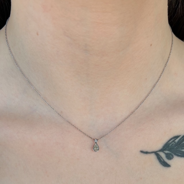 Crafted of 14k white gold, this pendant features a natural pear shape diamond and natural round brilliant diamond, set in bezels. Perfect for every day wear and the fancier occasions in life. We do our best to capture the vibrancy of the stones and metal, though this piece is even more beautiful in person! Crafted of 100% recycled metal and stones.