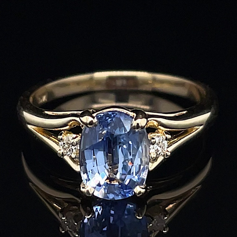 Crafted of 14k yellow gold, this beautiful ring features a genuine oval shape light blue sapphire in the center, flanked by natural round brilliant shape diamonds on each side. We do our best to capture the vibrancy of the stones and metal, though this ring is even more beautiful in person. Crafted of 100% recycled metal and stones.