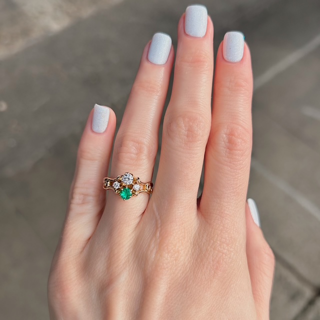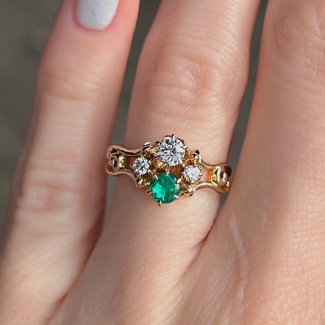 Crafted of 14k yellow gold, this Victorian ring features a genuine emerald and sparkling old European cut diamonds in an interesting scroll style mounting. We do our best to capture the vibrancy of the stones and metal, though this ring is even more beautiful in person.